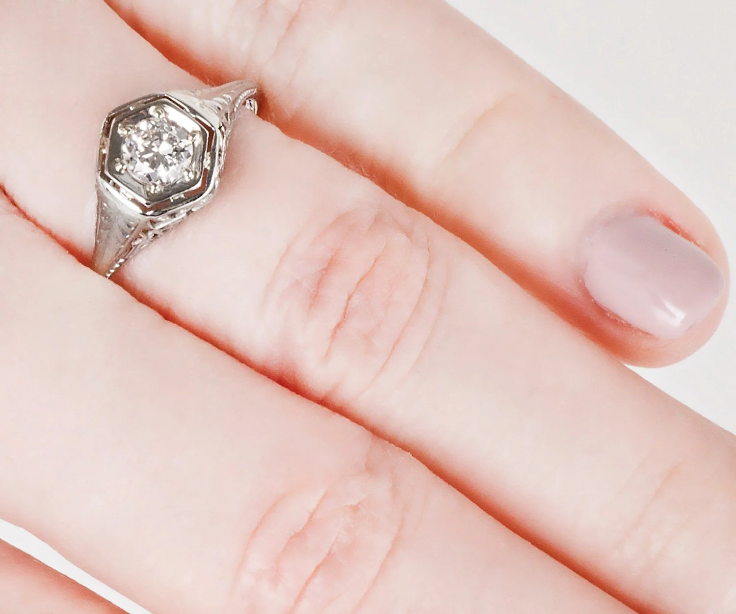 This beautiful Edwardian filigree ring is truly a statement. For the bride who is unique and loves intricate filigree, this hexagon shaped antique white gold ring would be a great choice.
