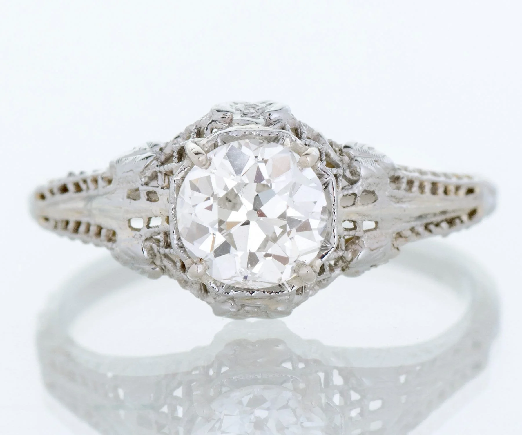 Light and airy and filled with stunning romantic details including fine filigree is this treasure of an Edwardian diamond engagement ring. Handcrafted in 18k white gold, this beauty holds a lovely European cut diamond of over a carat. Your bride to be will swoon over this one for many reasons!