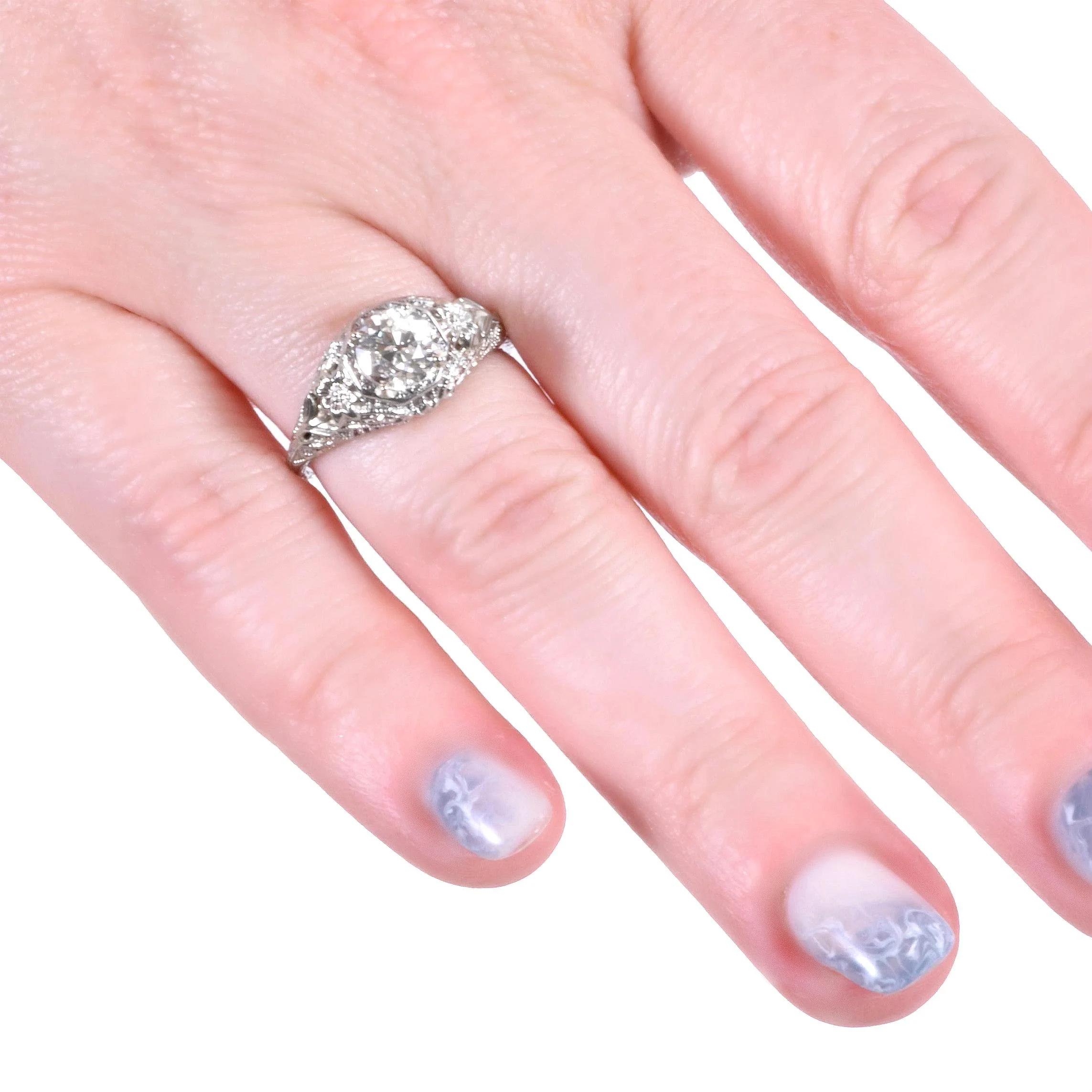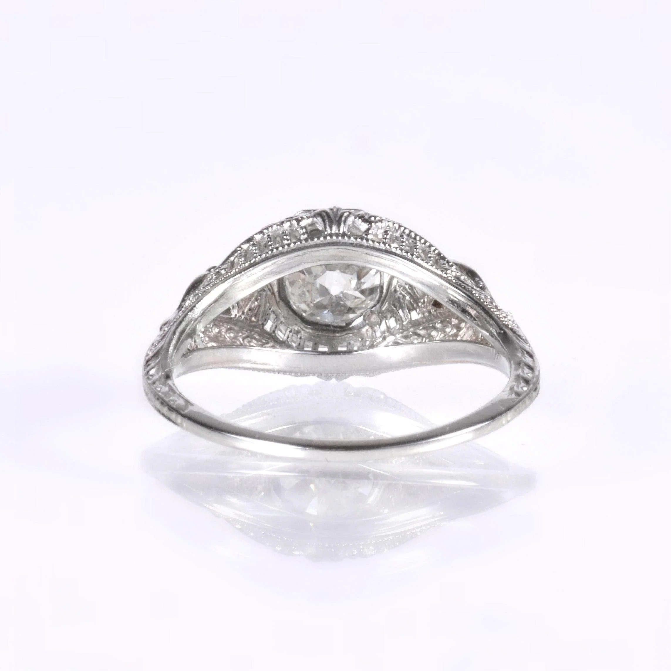 Antique Engagement Ring - Antique Edwardian 18k White Gold Daisy Filigree Engagement Ring 18k White Gold Circa 1910's European Cut Diamond =1.07ct SI2/K (GIA) Ring Size 6.5 (sizable) Ring measures approximately 9.5mm at center. Back of band measures 1mm wide with a 1.2mm rise.