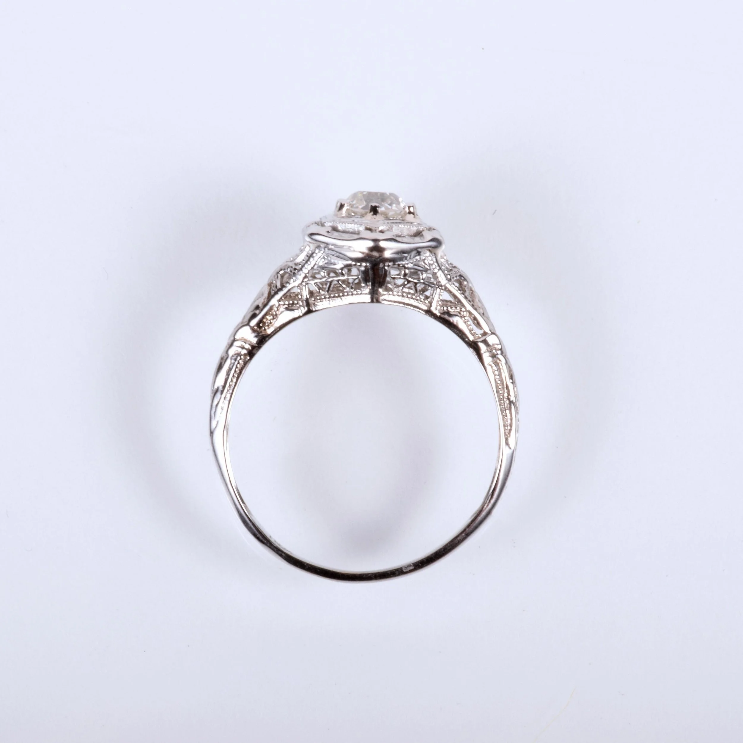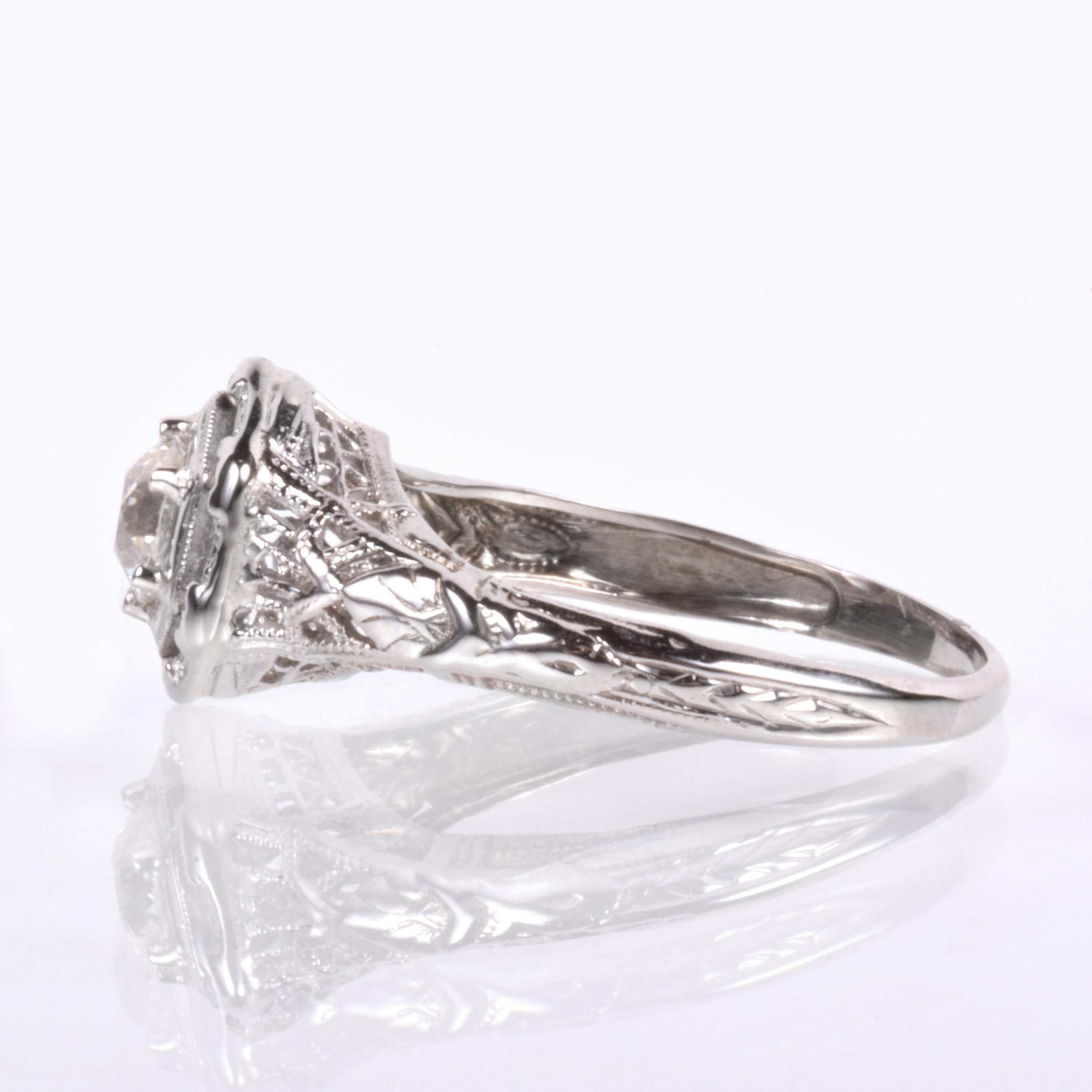 This is a great antique example of a decorative and detailed 18k white gold setting without being over the top! An Edwardian delight, filled with fine filigree work and varying textures. This little antique treasure showcases a glorious European cut diamond at its center within a lovely six-sided setting. Make her yours!