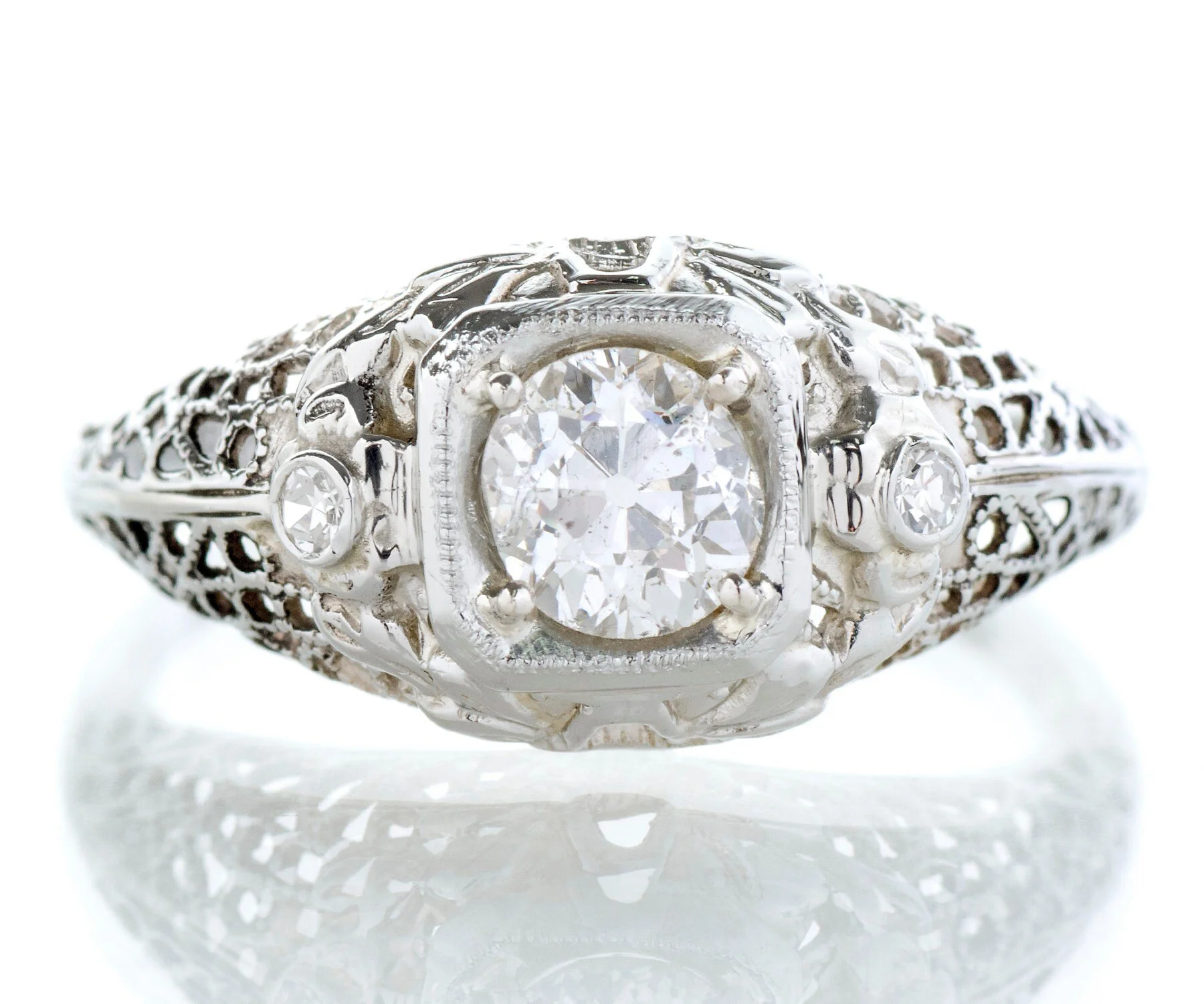 The European cut diamond peeking out of the center of this stunning 18k white gold Edwardian setting is a spectacular color! The very detailed setting is complete with open pierced work, two adorning diamonds, nature motif and squared bezel.