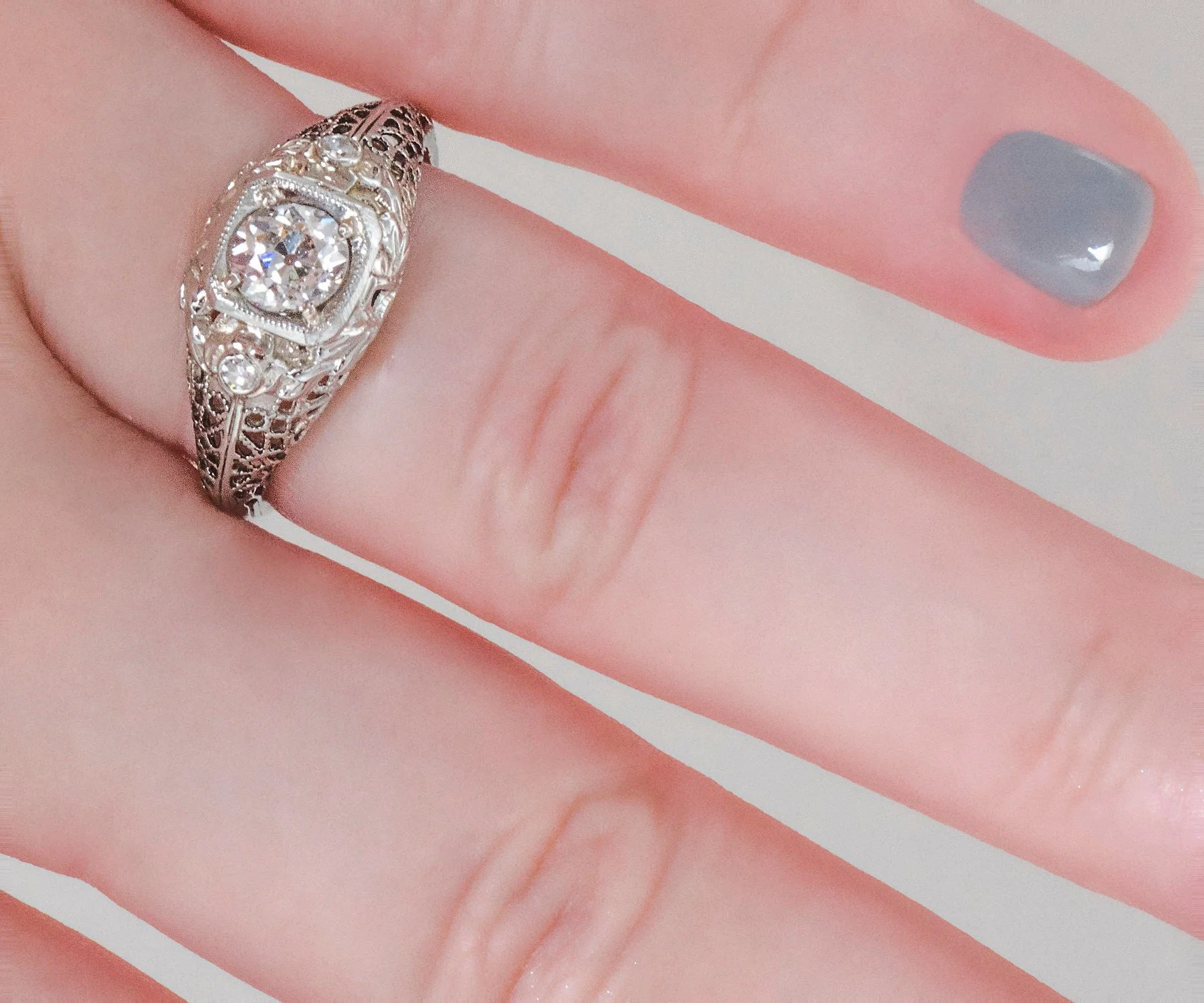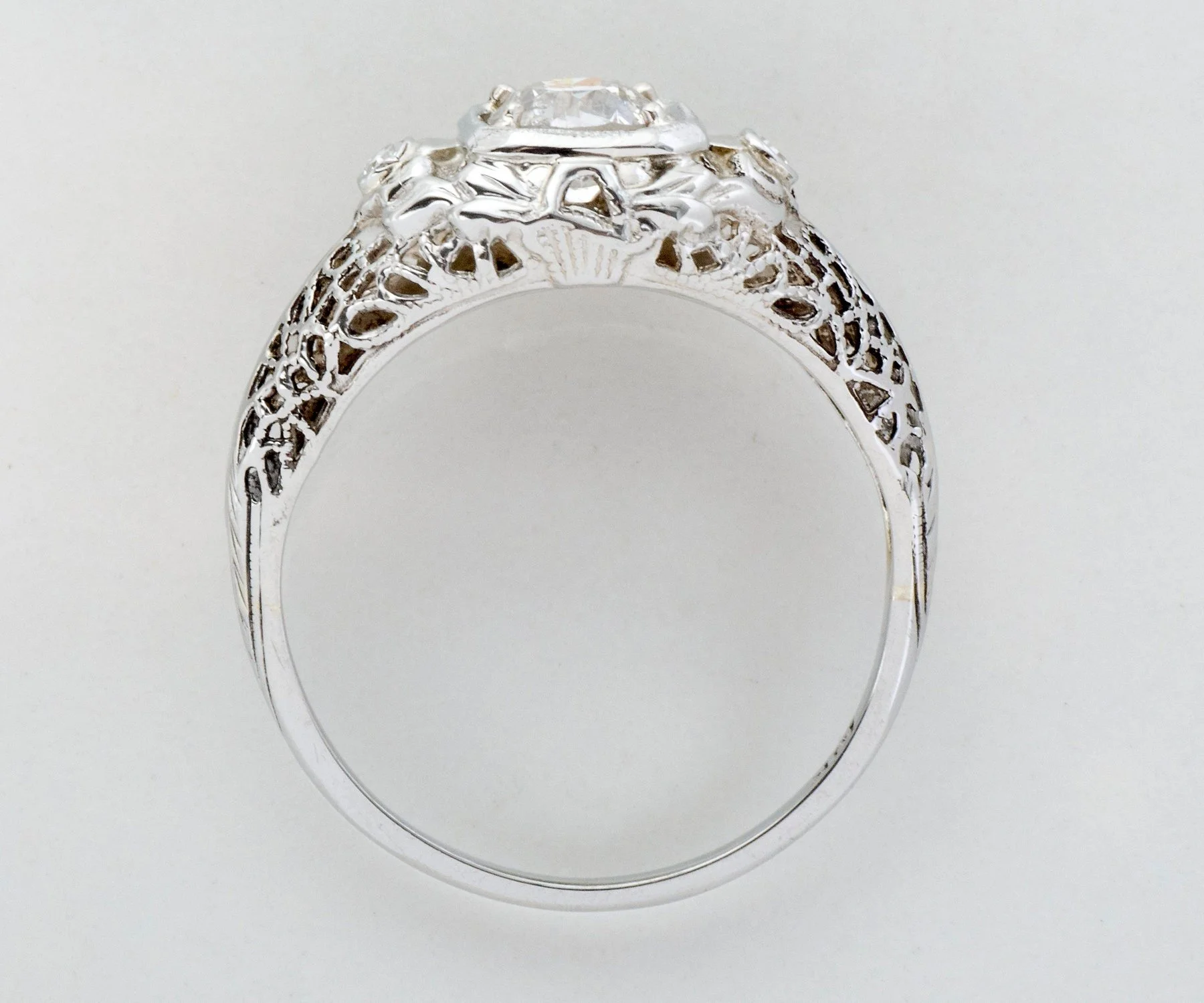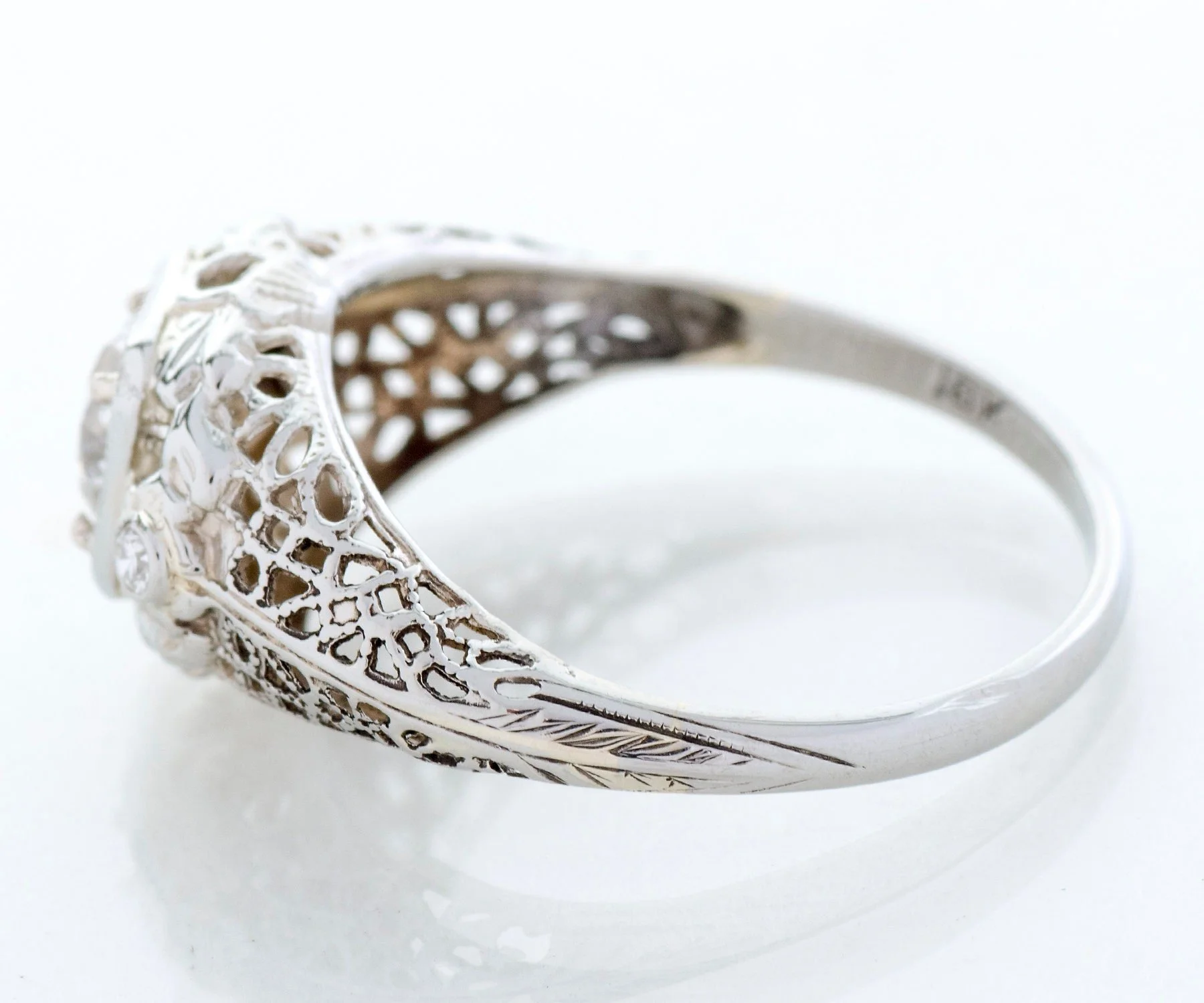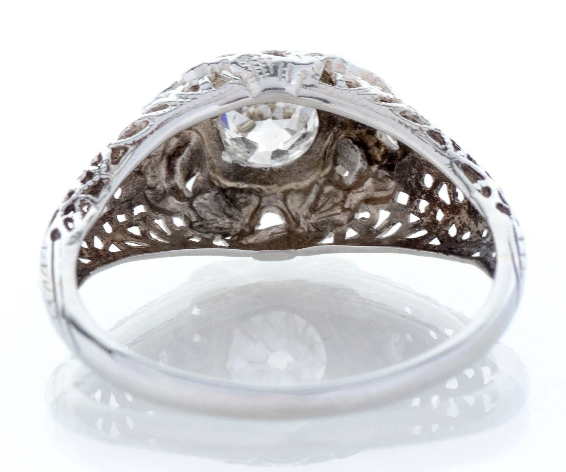 The European cut diamond peeking out of the center of this stunning 18k white gold Edwardian setting is a spectacular color! The very detailed setting is complete with open pierced work, two adorning diamonds, nature motif and squared bezel.