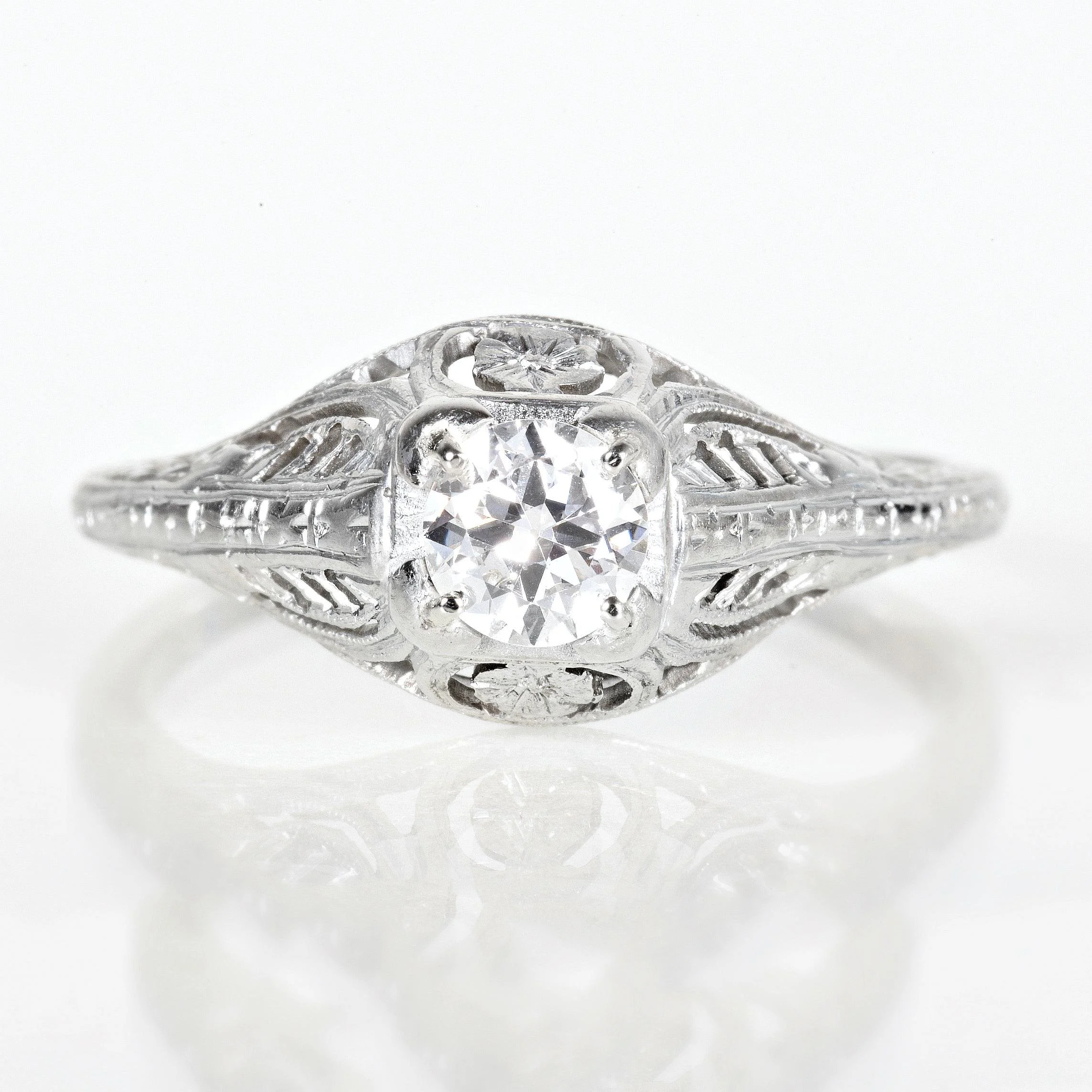 Antique Engagement Ring - Antique Edwardian 18k White Gold Diamond Engagement Ring Circa 1910's 18k White Gold European Cut Diamond =.33ct VS2/F Ring Size 6 (sizable) Ring measures approximately 8.2mm wide at center, back of band is 1.3mm wide.