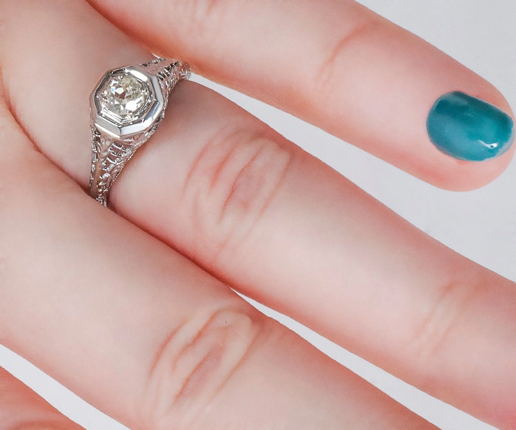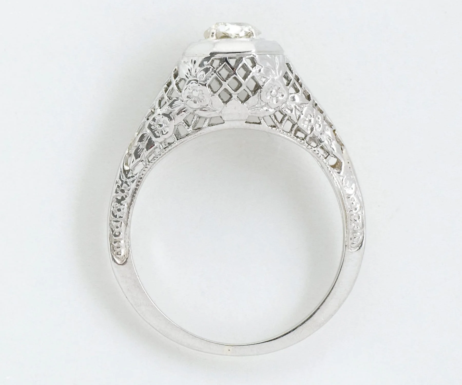Fine, fine wire work and sweet little engraved blossoms define this lovely antique Edwardian diamond engagement ring. Created in 18k white gold, this charming ring holds a 1/4 carat European cut diamond within an octagonal setting.