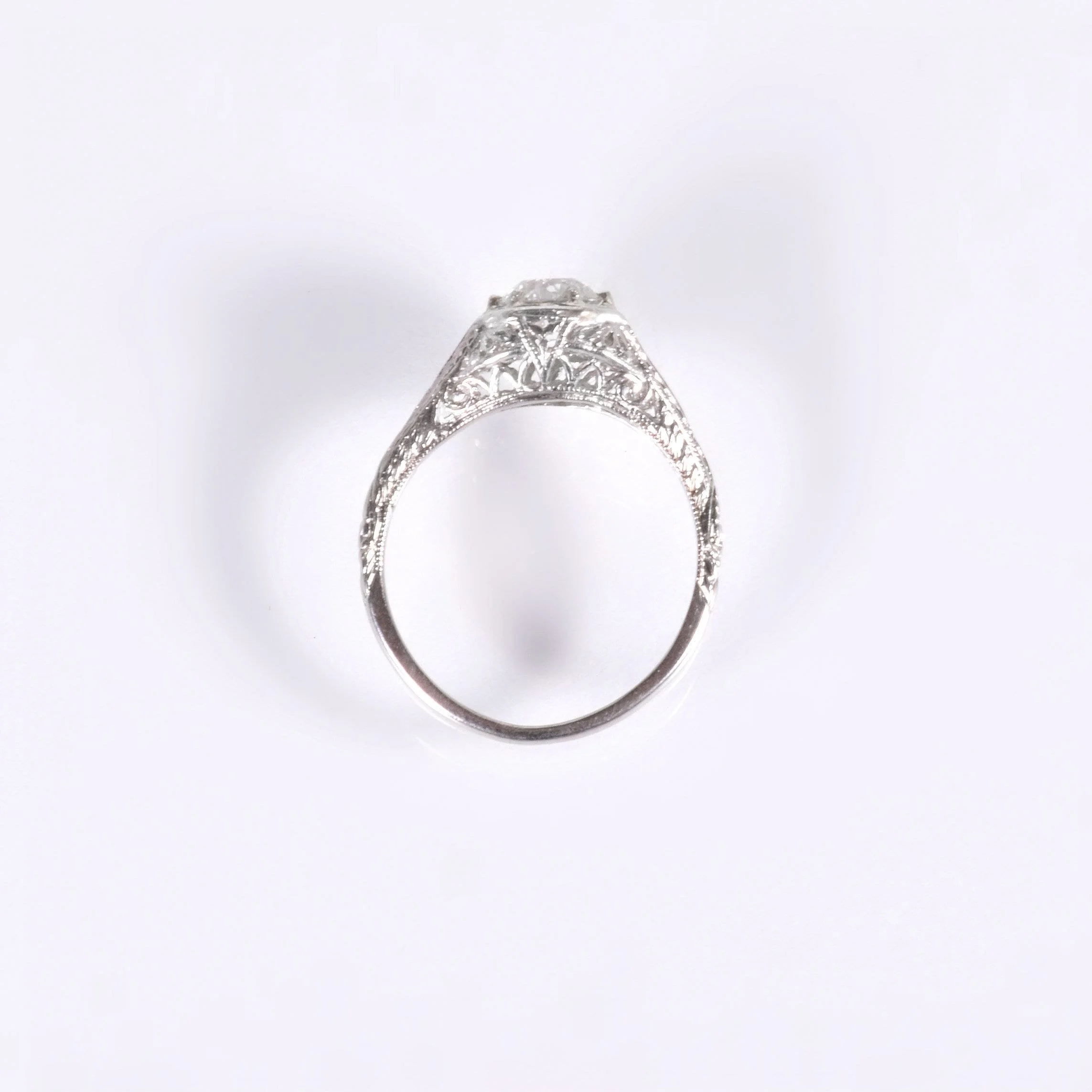 This classic charmer from the 1910's is ready to begin its new life with you! An exceptional European cut diamond sits snugly within prongs and hexagonal bezel showing its brilliance. The diamond comes with a GIA certification. Besides beautiful cuts outs in the antique 18k white gold setting, you can see the wheat pattern down the shoulders and shank of the ring. The wheat pattern was thought to signify a few things including a bountiful harvest, a connection to the natural world and fertility!