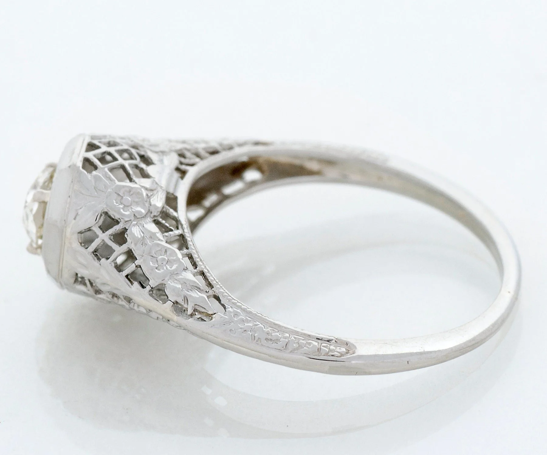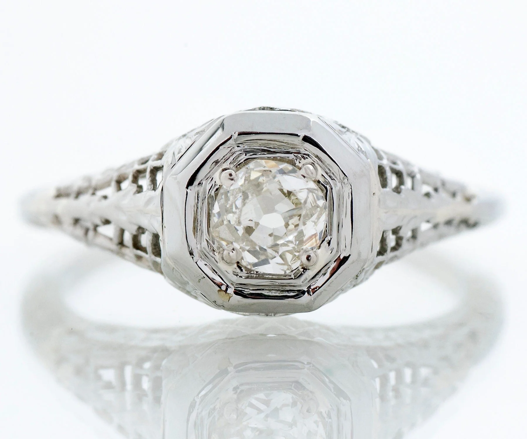 Fine, fine wire work and sweet little engraved blossoms define this lovely antique Edwardian diamond engagement ring. Created in 18k white gold, this charming ring holds a 1/4 carat European cut diamond within an octagonal setting.