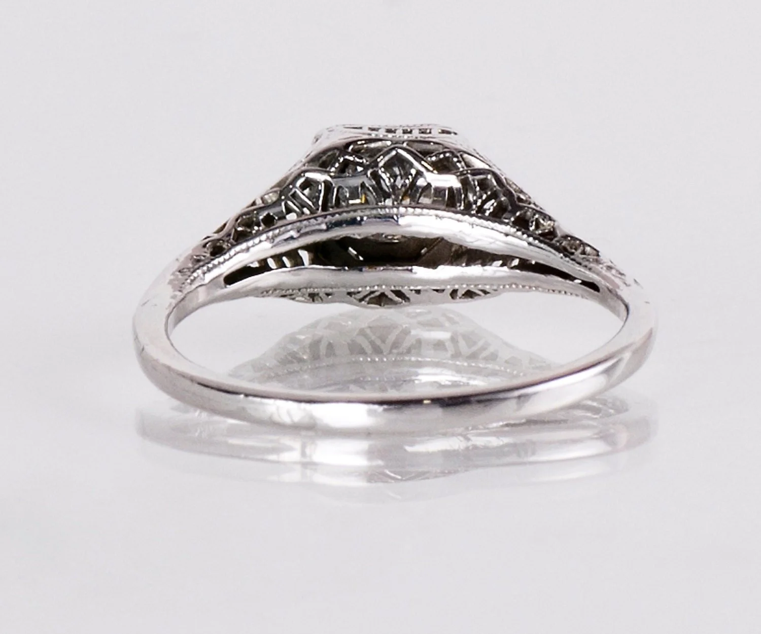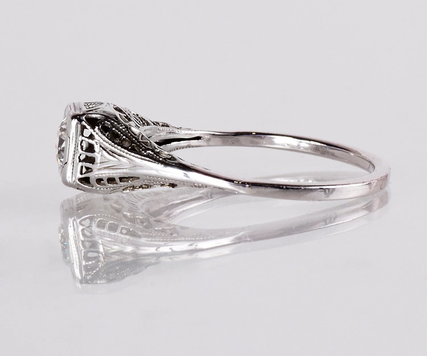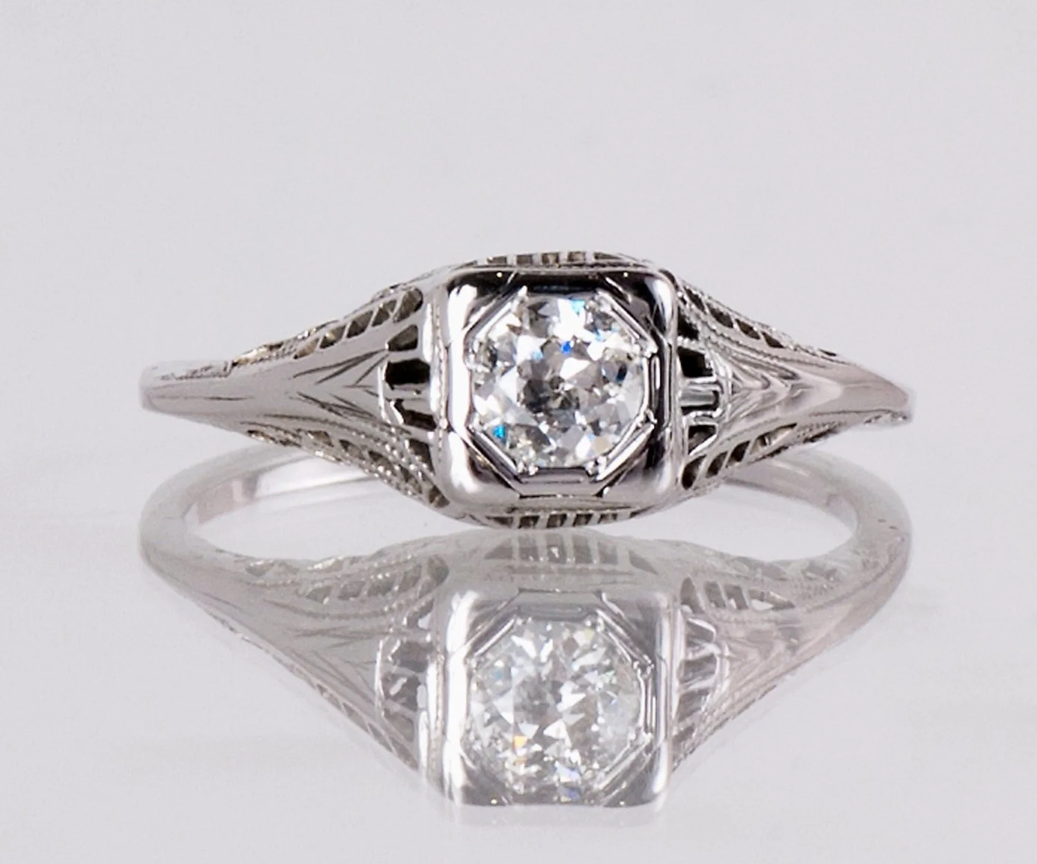 This Edwardian ring displays unique and romantic swirls of filigree from every angle. If you are looking to propose with a uniquely beautiful ring, look no further.