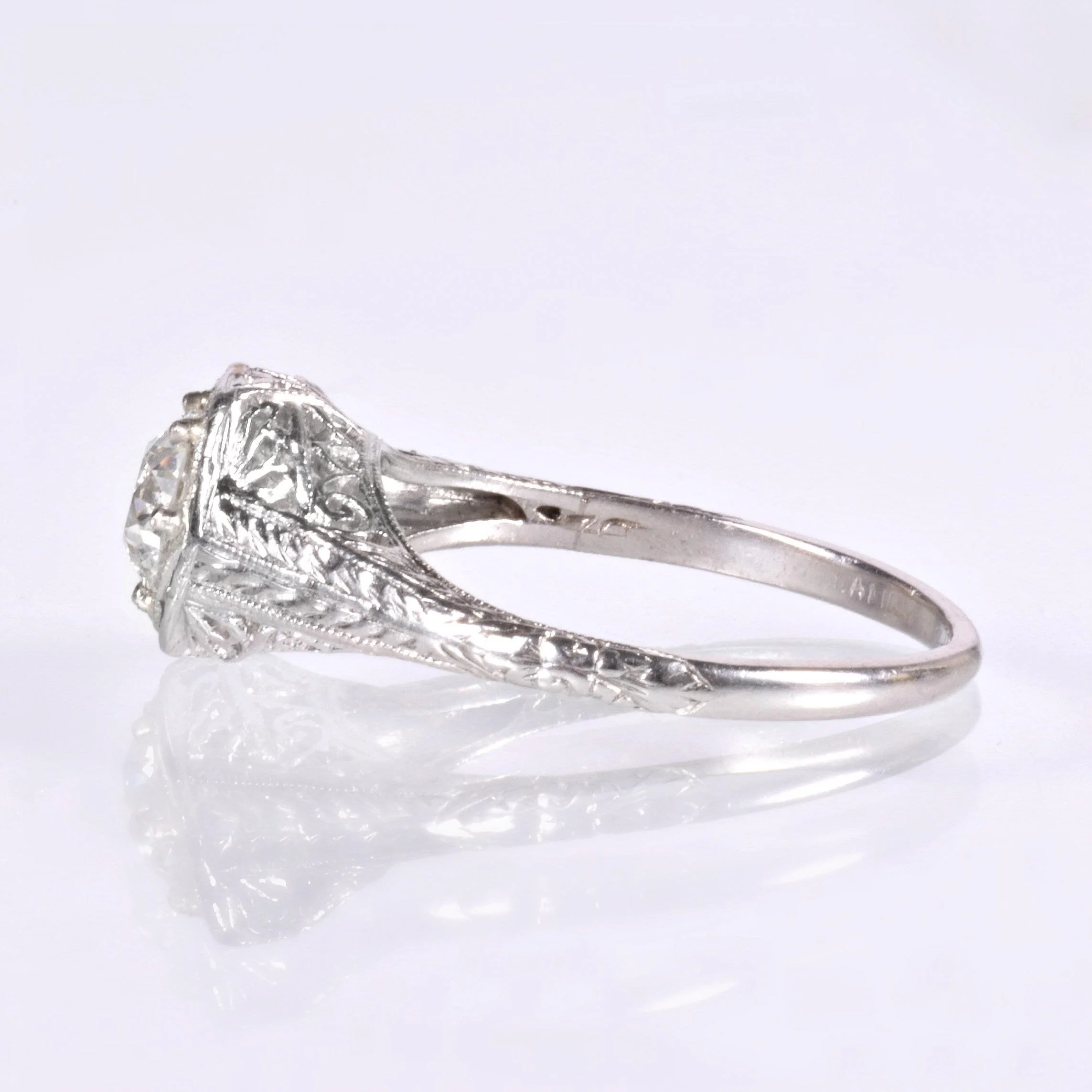 Antique Engagement Ring - Antique Edwardian 18k White Gold Diamond Engagement Ring Late 1910's 18k White Gold European Cut Diamond =.62ct SI1/H (GIA) Ring Size 5.25 (sizable) Ring measures approximately 8mm tall at center, back of band is 1.5mm wide.