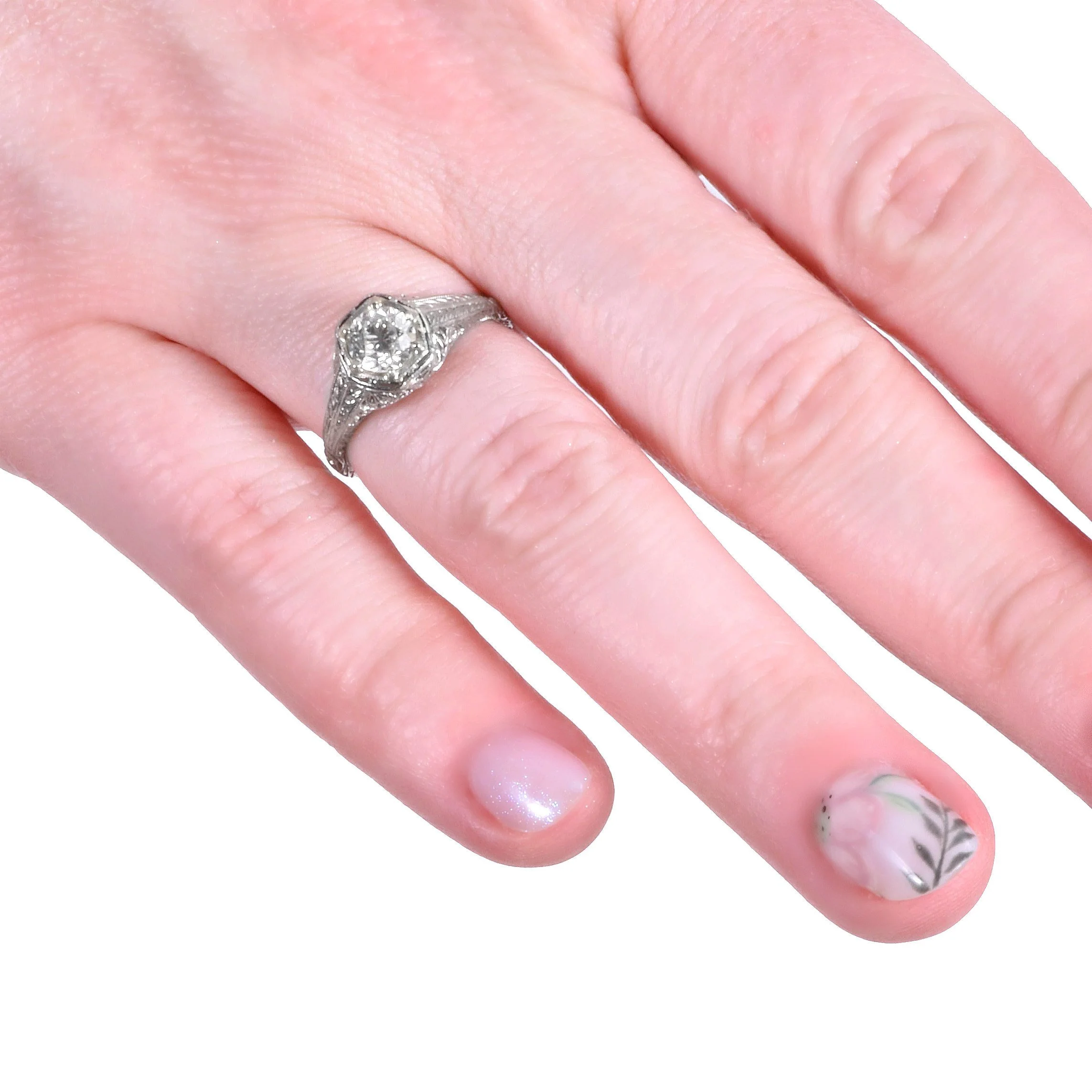 This classic charmer from the 1910's is ready to begin its new life with you! An exceptional European cut diamond sits snugly within prongs and hexagonal bezel showing its brilliance. The diamond comes with a GIA certification. Besides beautiful cuts outs in the antique 18k white gold setting, you can see the wheat pattern down the shoulders and shank of the ring. The wheat pattern was thought to signify a few things including a bountiful harvest, a connection to the natural world and fertility!