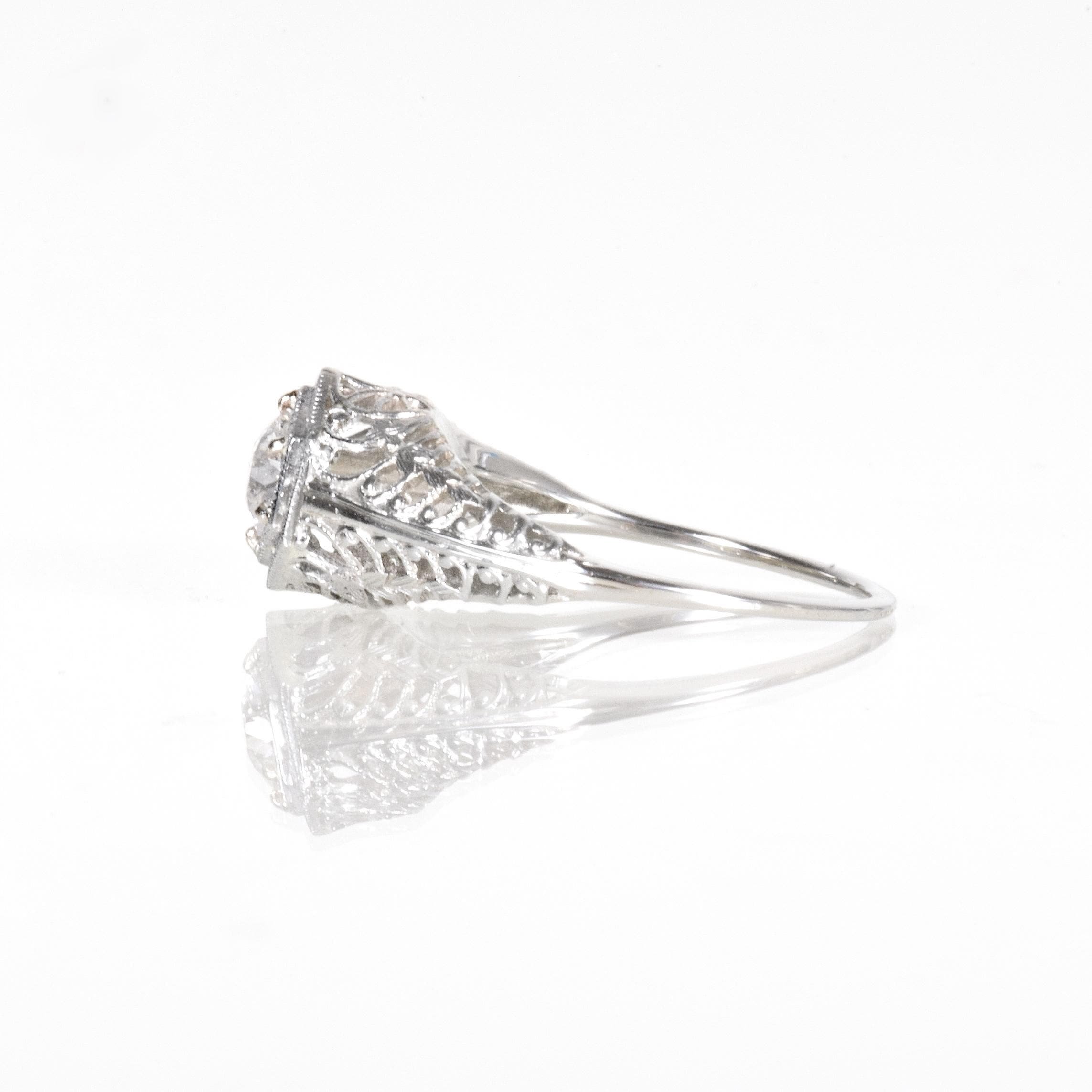 Within a double six sided framework, finished in fine milgrain sits a sweet European cut diamond patiently waiting for its second life to begin with you! From the 1910's, this little charmer features delicate and eye-catching open wire work all around, spectacular from every angle! Crafted in 18k bright white gold.