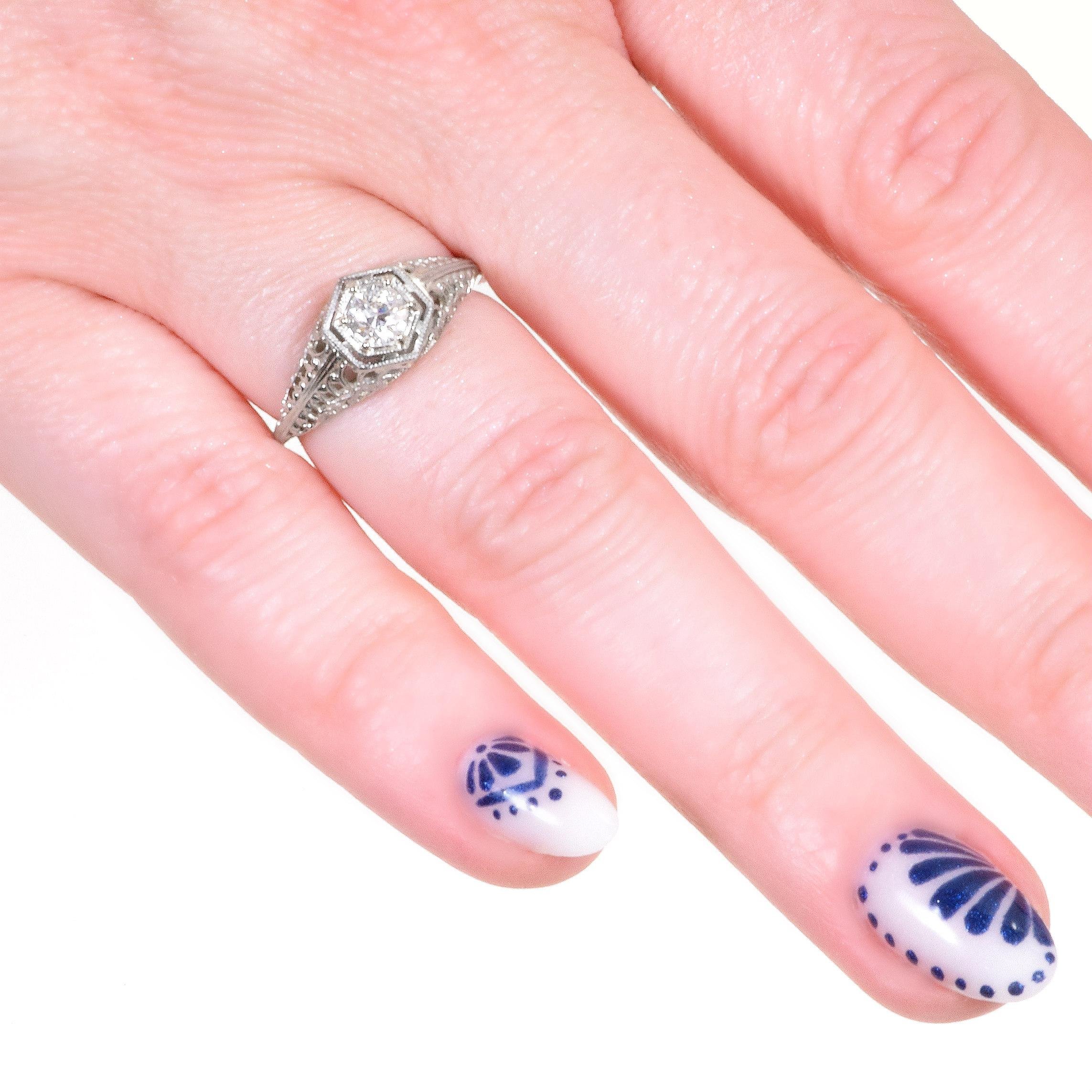 Antique Engagement Ring - Antique Edwardian 18k White Gold Diamond Engagement Ring Circa 1910's 18k White Gold European Cut Diamond =.31ct SI1/H Ring Size 5 (sizable) Ring measures approximately 8mm wide at center, back of band is .9mm and .8mm wide in each direction.