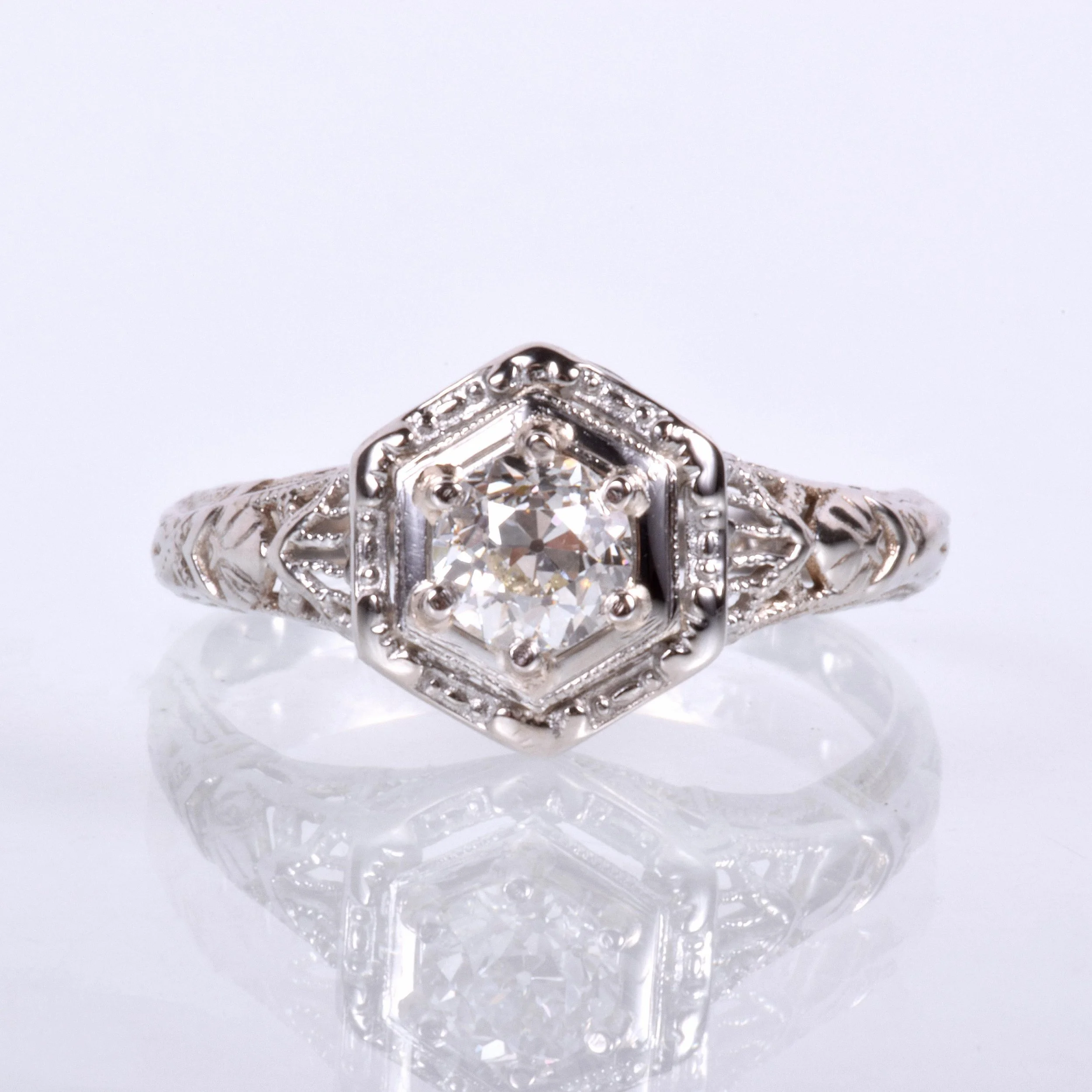 This is a great antique example of a decorative and detailed 18k white gold setting without being over the top! An Edwardian delight, filled with fine filigree work and varying textures. This little antique treasure showcases a glorious European cut diamond at its center within a lovely six-sided setting. Make her yours!