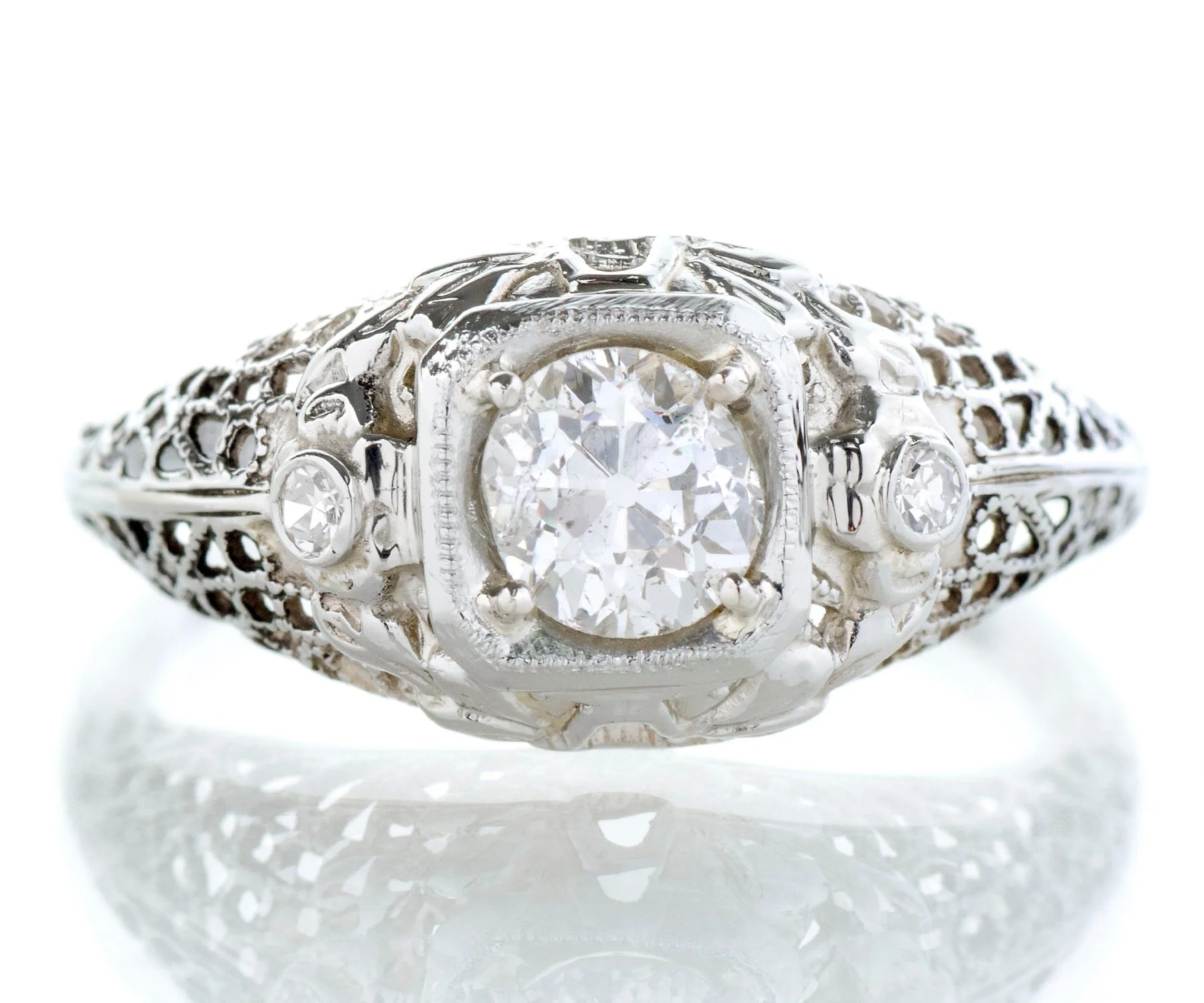 Antique Engagement Ring - Antique Edwardian 18k White Gold Diamond Engagement Ring 1910's 18k White Gold European Cut Diamond =.58ct SI2/F Ring Size 6.75 (sizable) Ring measures approximately 9.4mm at center, back of band is 1.4mm wide.