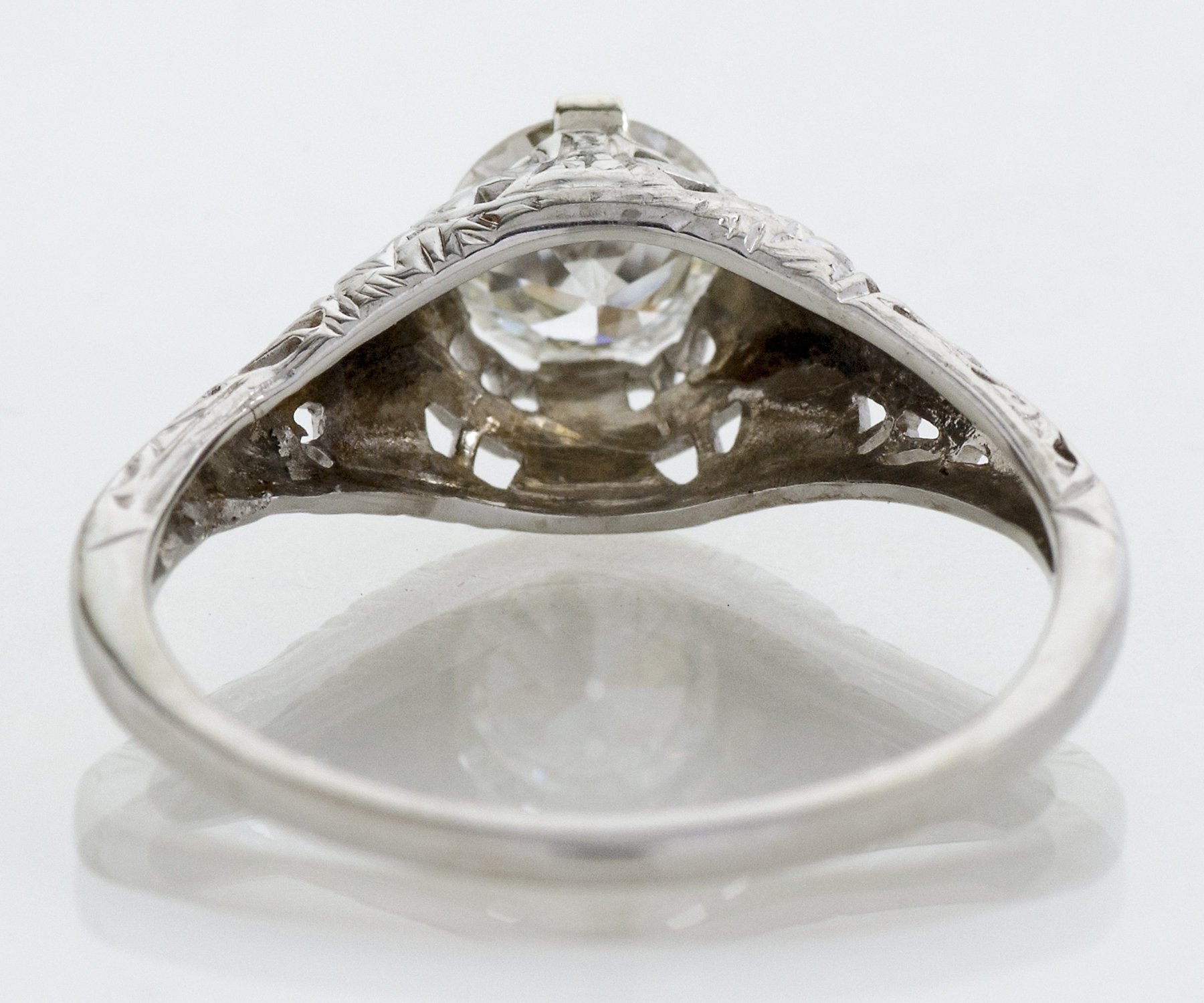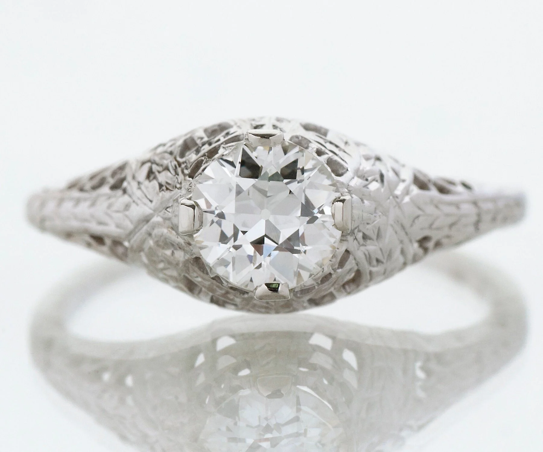 A lovely, detailed with open work Edwardian antique setting is host to a stunning European cut diamond of .66 carats. This bright 18k white gold setting also displays a crisp wheat pattern along the sides of the shank. The wheat pattern was thought to signify a few things including a bountiful harvest, a connection to the natural world and fertility! From the early 1900's.