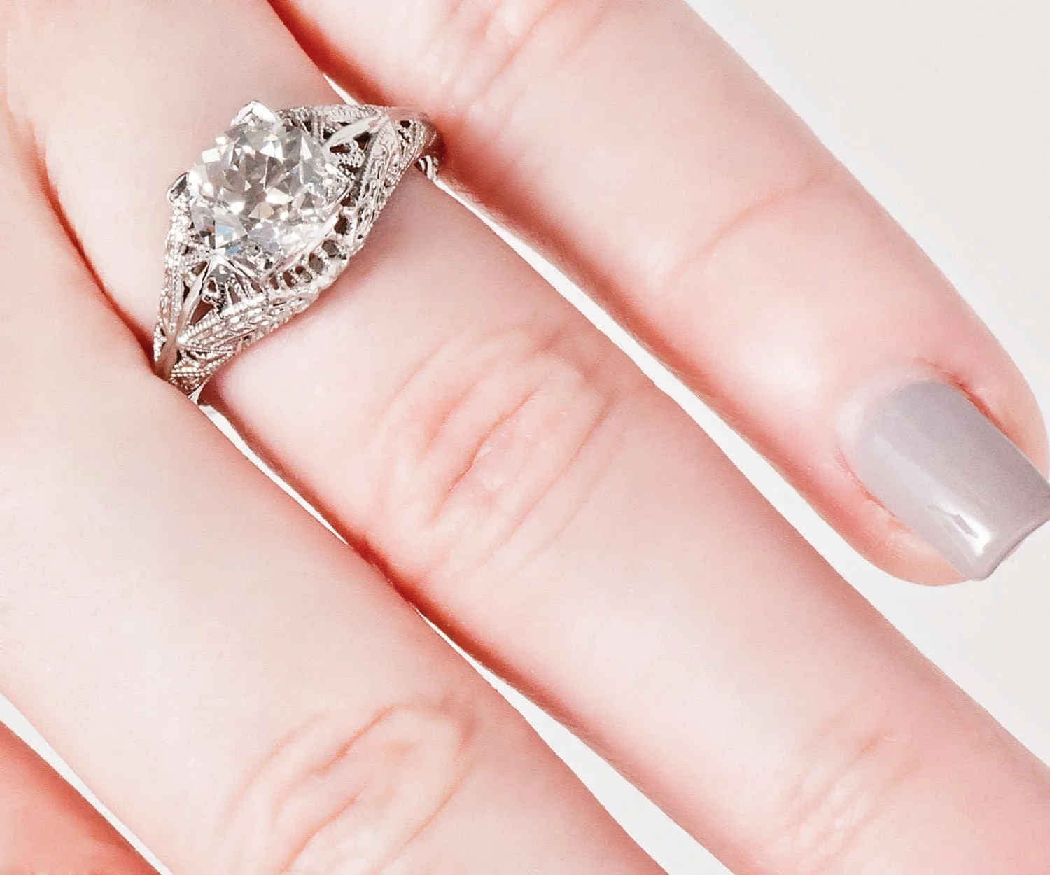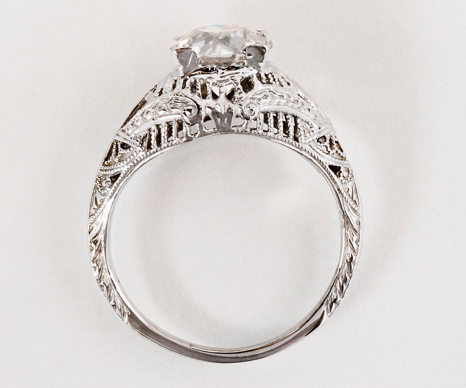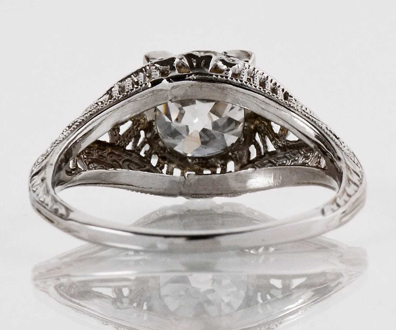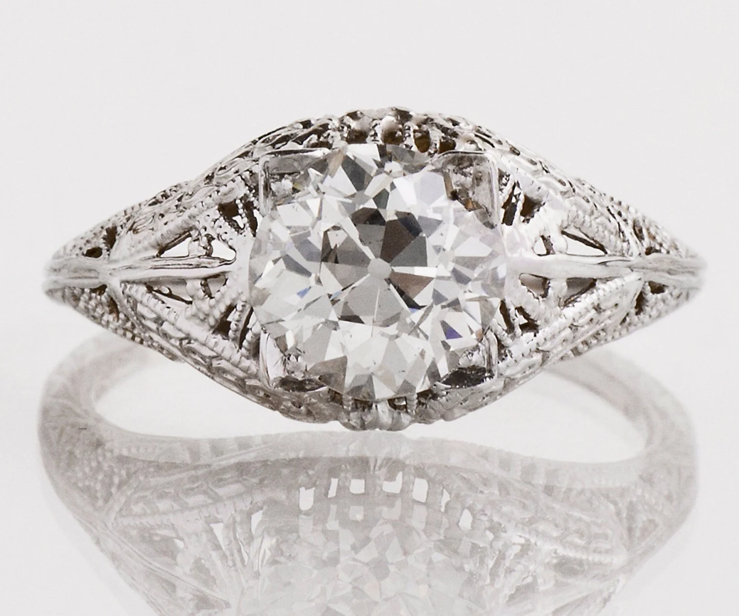 This gorgeous antique engagement ring is a lot of sparkle at an excellent price. With a brilliant Old European Cut Diamond of 1.69cts, this ring is nothing short of fabulous and romantic. With intricate wired filigree detail, this Edwardian ring would make a future bride very happy.