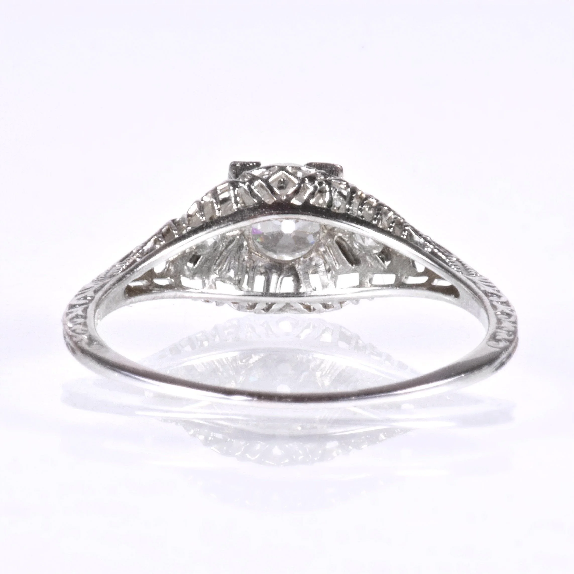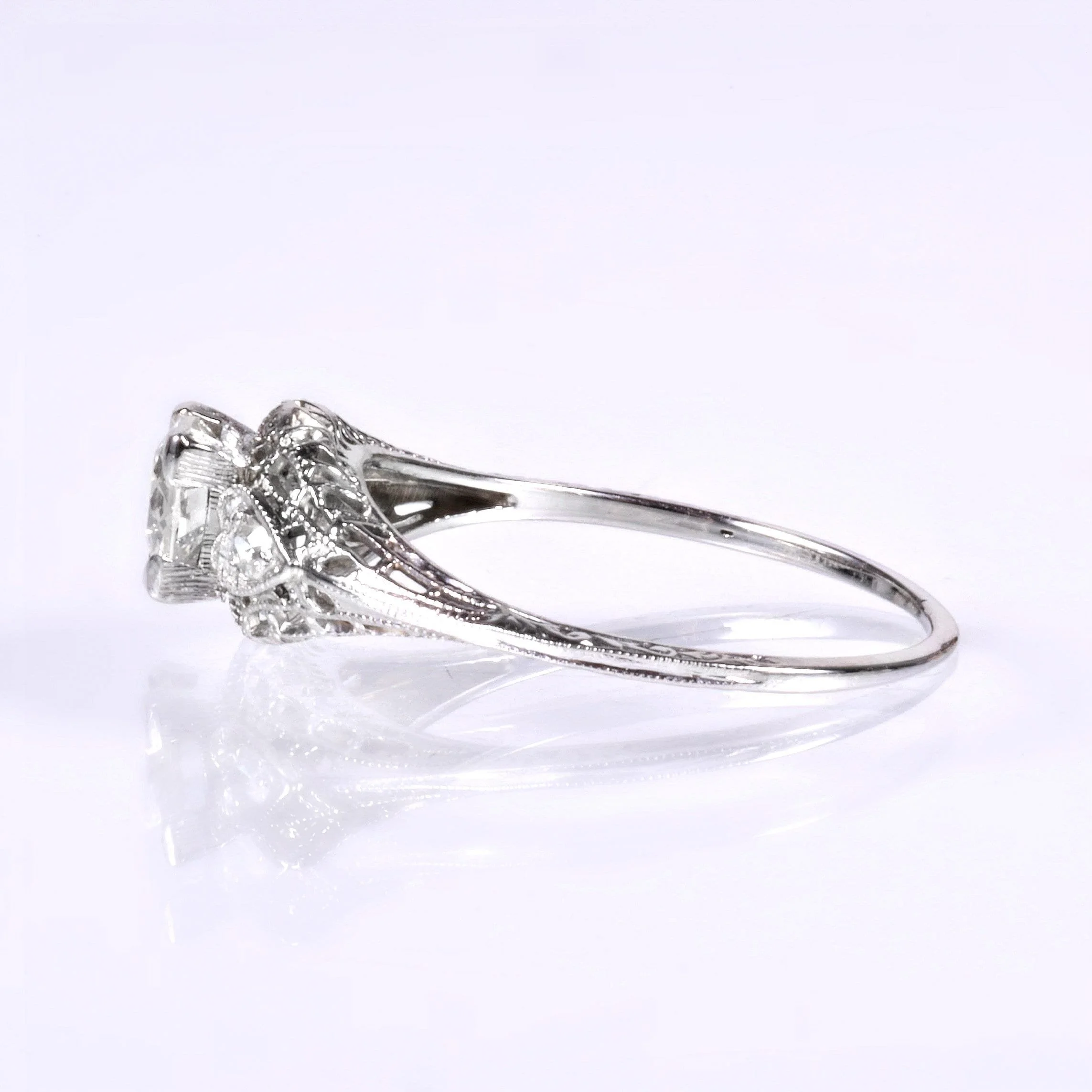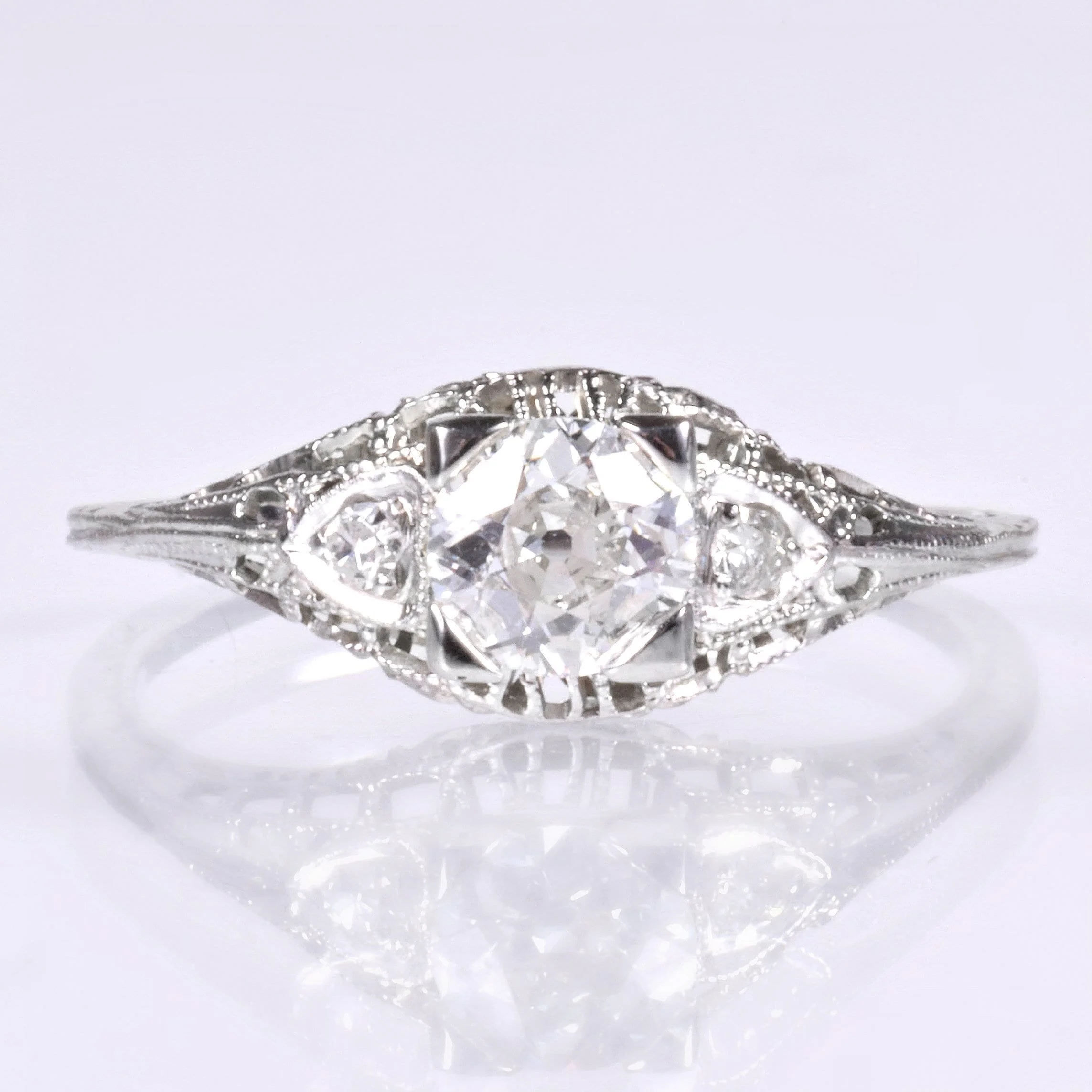 Hearts!! Some women really adore them in design. This dreamy Edwardian diamond engagement ring is indeed flanking the center European cut diamond with hearts. From the early 1900's, this stunner was created in bright 18k white gold and it filled with lovely filigree. A wonderful antique treasure to propose with!