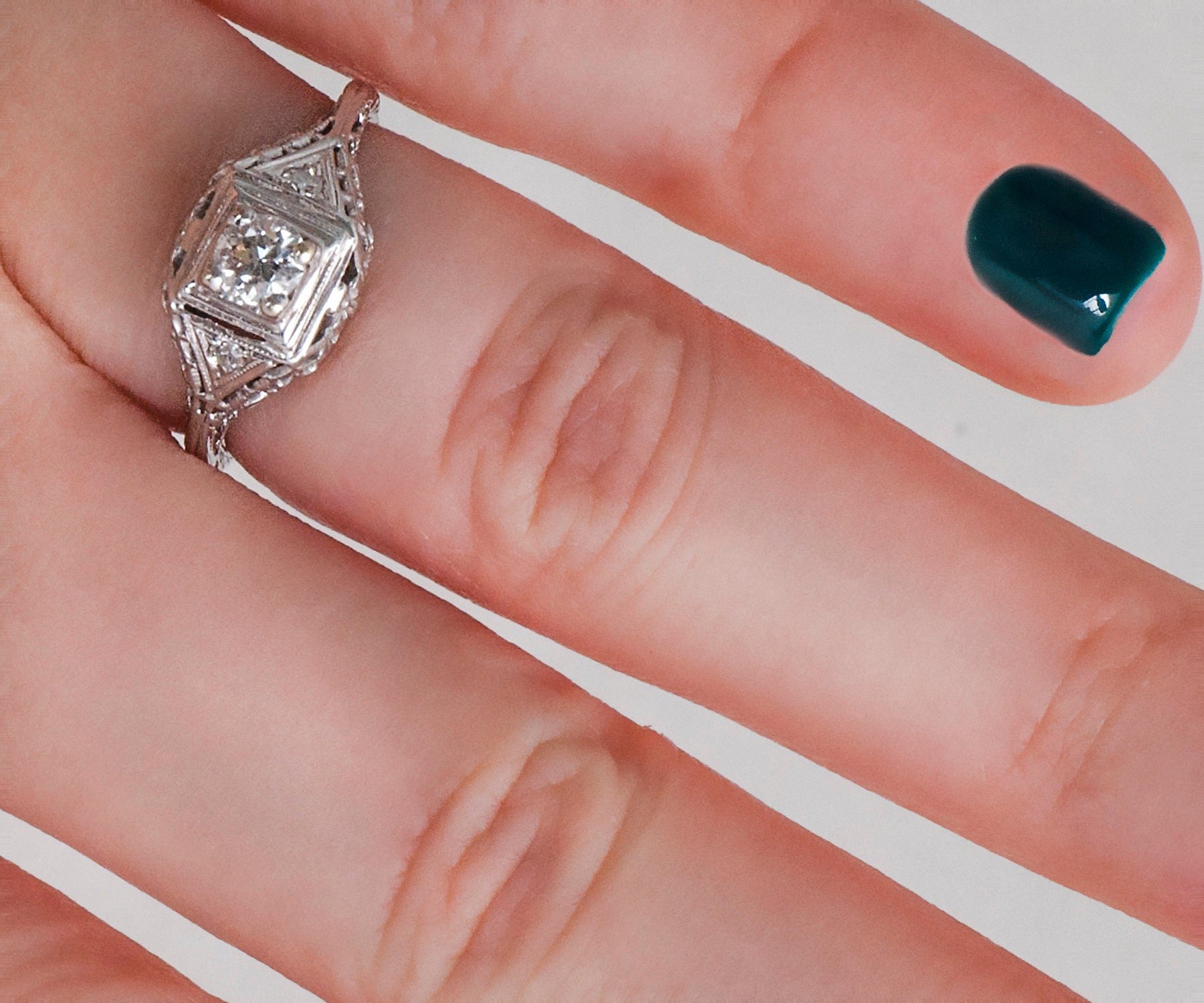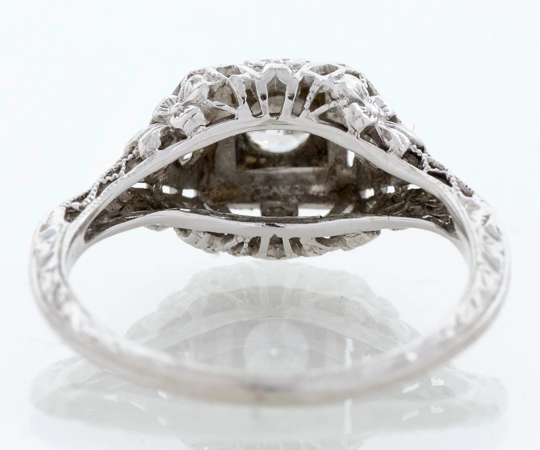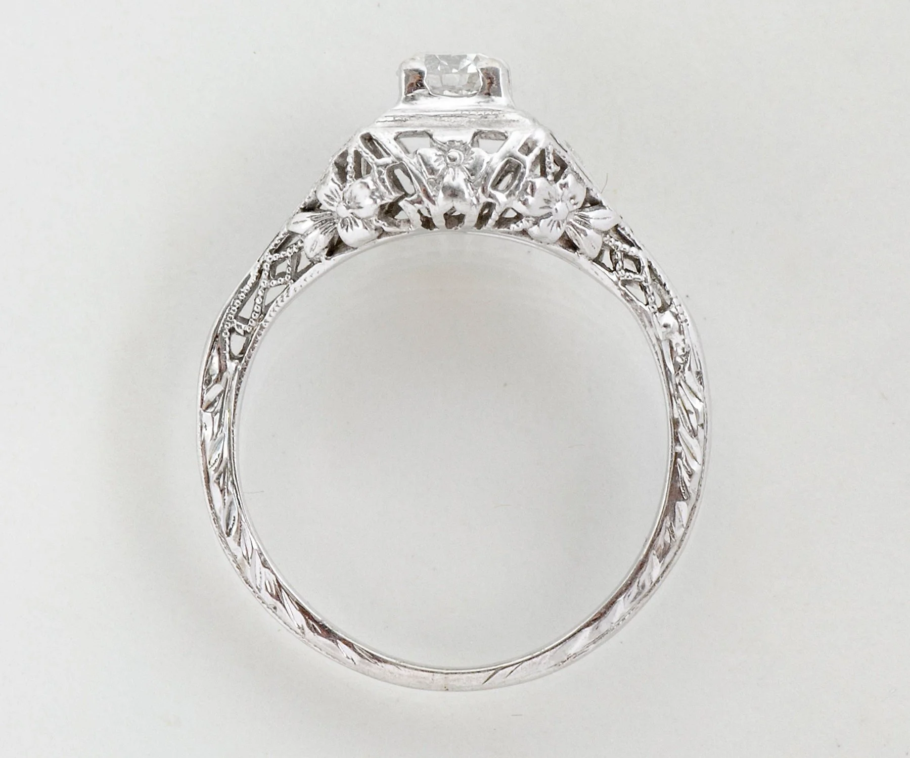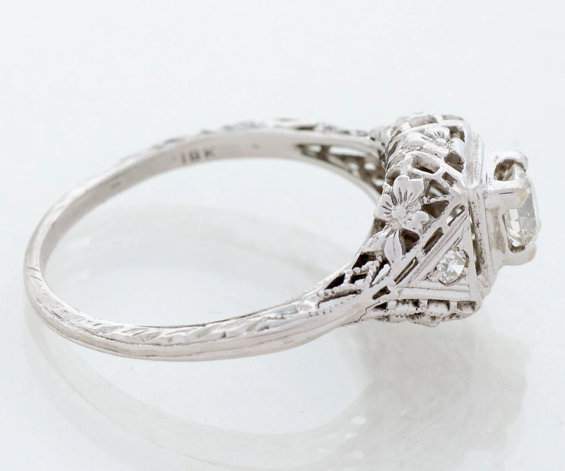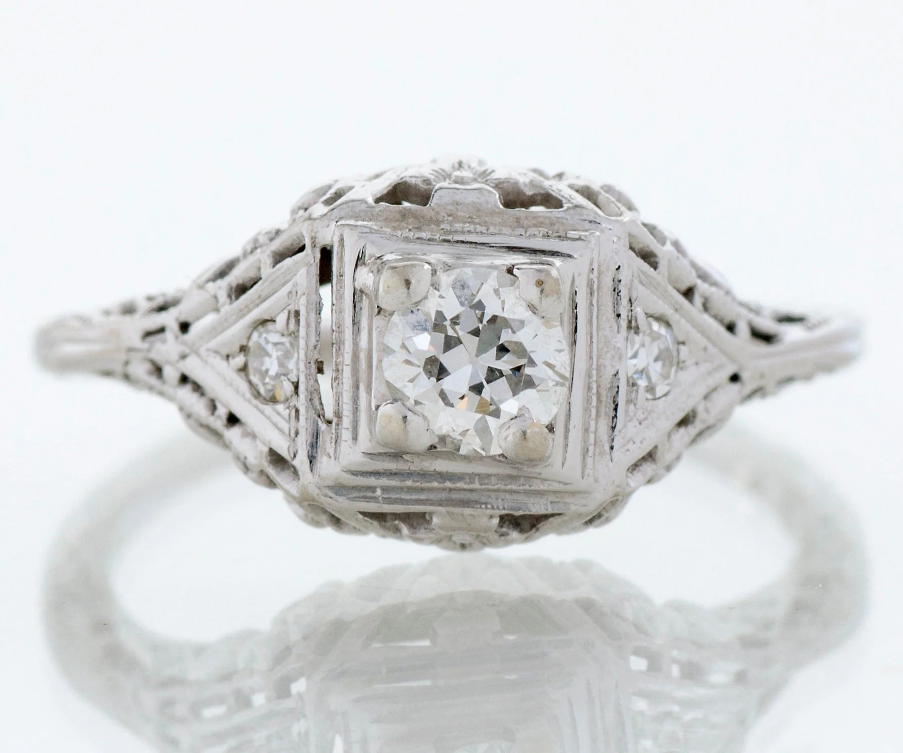 Antique Engagement Ring - Antique Edwardian 18k White Gold Filigree Diamond Engagement Ring Edwardian 18k White Gold European Cut Center Diamond =.25ct VS1/G 2 Side Diamonds =.04ct VS2/G-H Ring Size 5-1/8 (ring is sizable) Ring measures approximately 8.7mm at center, back of band is 1.3mm wide.