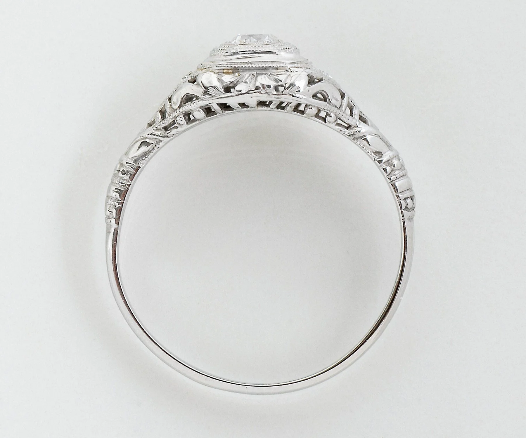 This darling Edwardian beauty is ready for its second debut! So many wonderful details make up this antique diamond engagement ring including lovely filigree work and fine milgrain. A European cut diamond sits nestled within its 8 prongs in an eye-catching octagonal setting crafted in 18 k white gold.