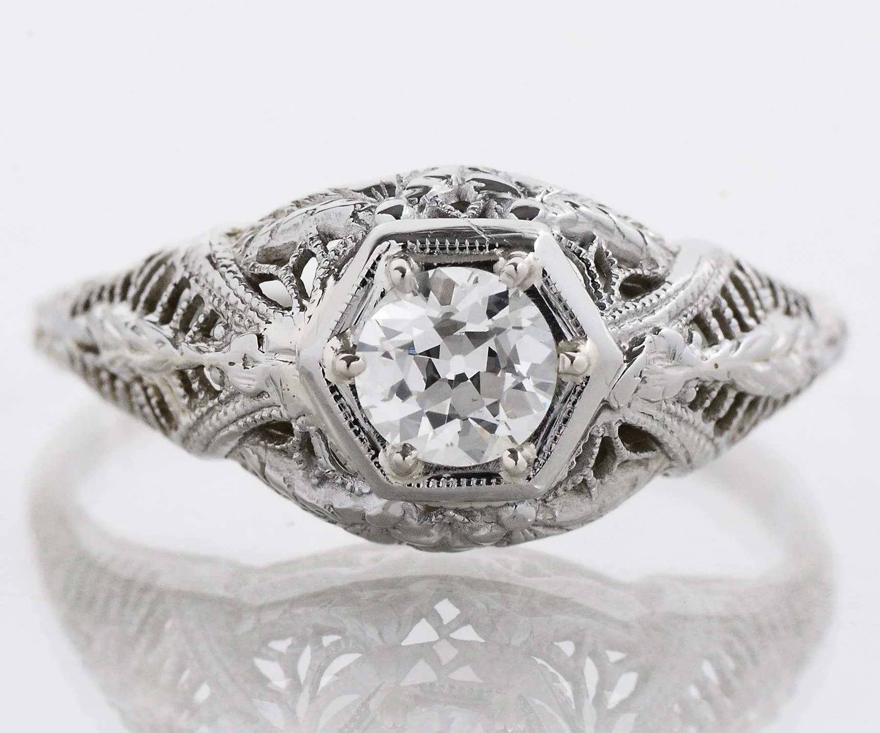 This 18 k white gold Edwardian beauty will make her head spin! So decorative with tiny petite blossoms, a wheat pattern and fabulous fine filigree. Set in 6 prongs with beadwork surrounding it, a lovely European cut diamond of .38 carats sits lovingly at the center of this antique treasure.