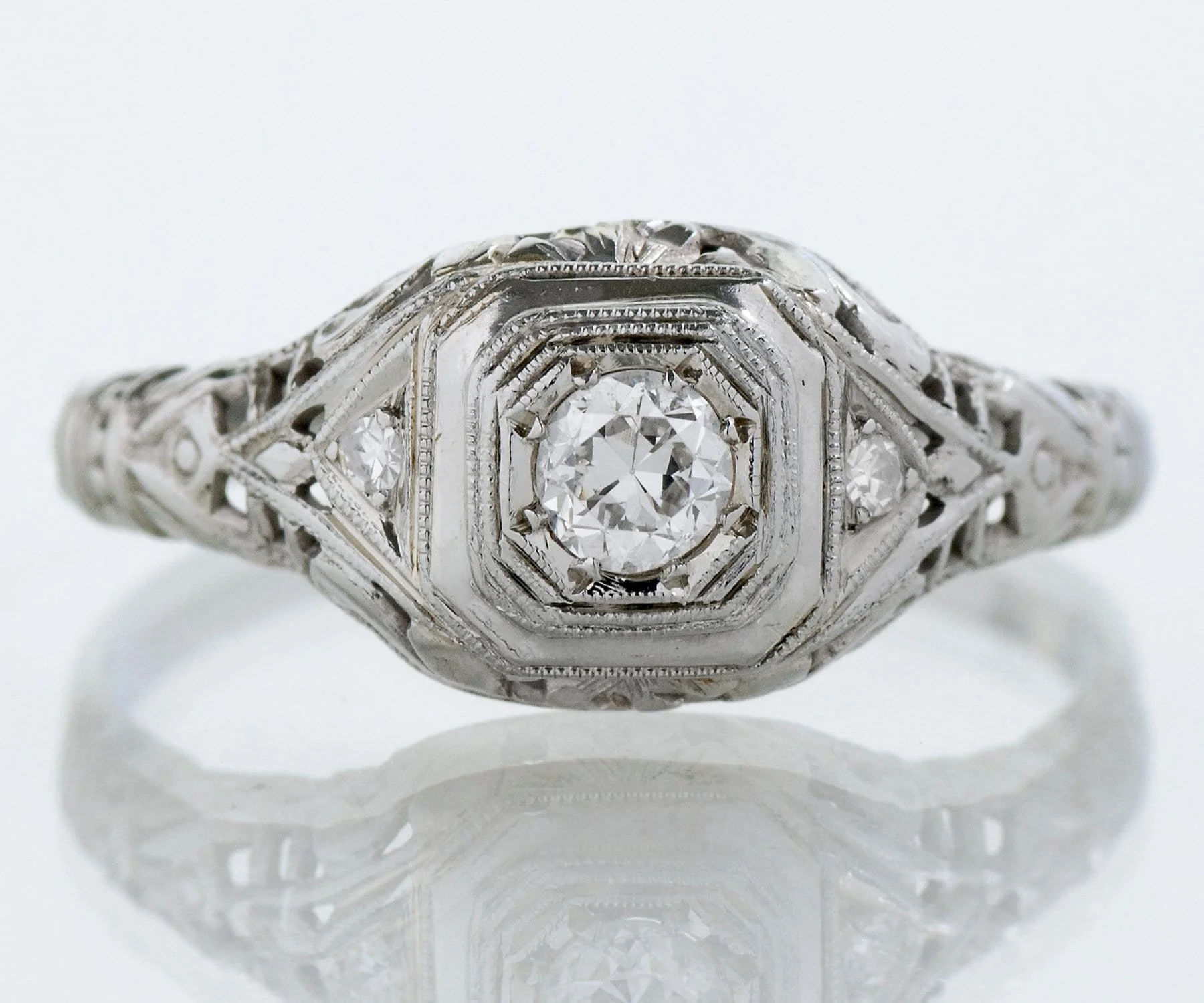 This darling Edwardian beauty is ready for its second debut! So many wonderful details make up this antique diamond engagement ring including lovely filigree work and fine milgrain. A European cut diamond sits nestled within its 8 prongs in an eye-catching octagonal setting crafted in 18 k white gold.