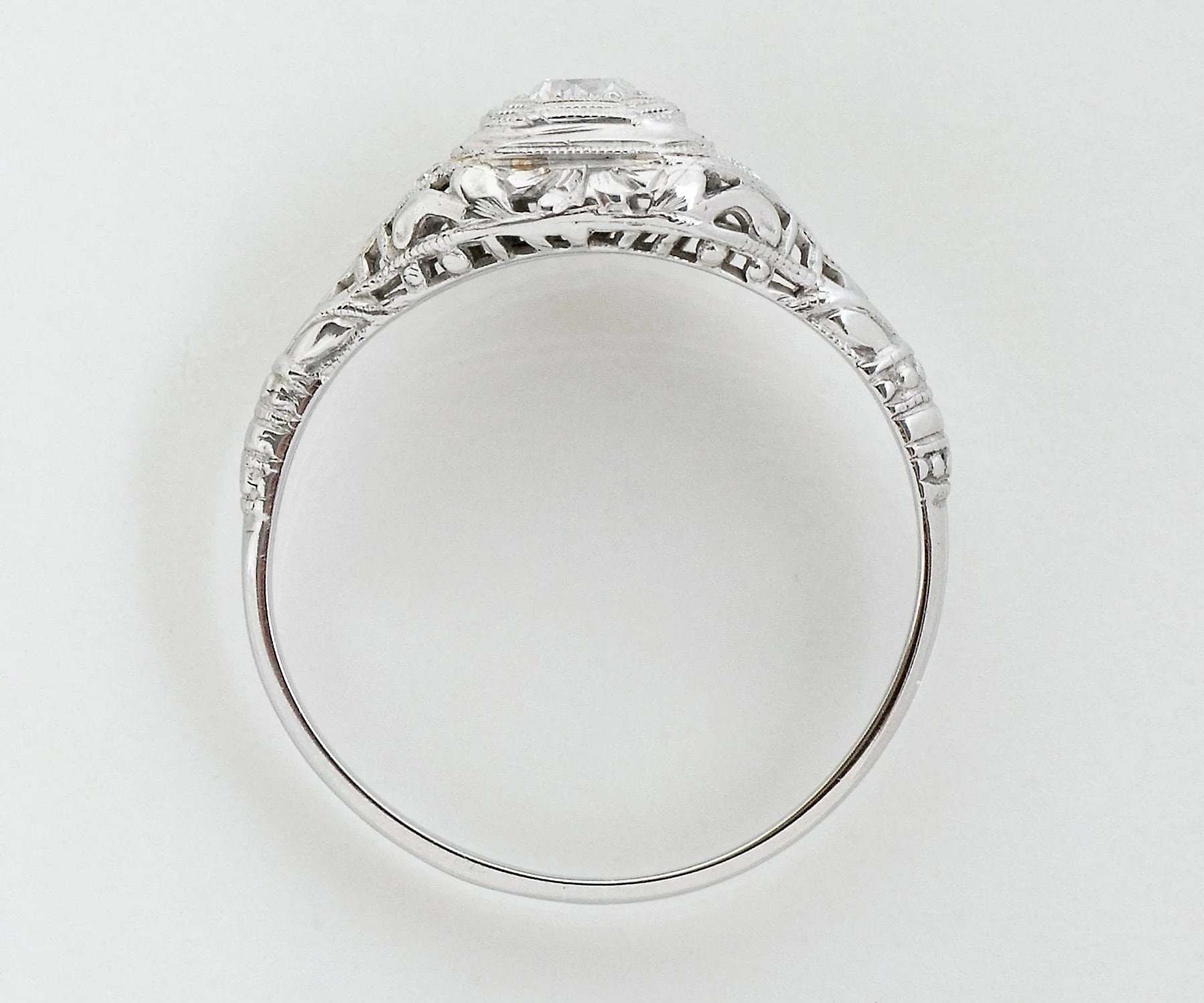 Antique Engagement Ring - Antique Edwardian 18 White Gold Filigree Diamond Engagement Ring Edwardian 18k White Gold European Cut Center Diamond =.20ct SI1/G 2 Side Diamonds =.03ct SI1/G Ring Size 6.75 (ring is sizable) Ring measures approximately 8.3mm at center, back of band is 2mm wide.