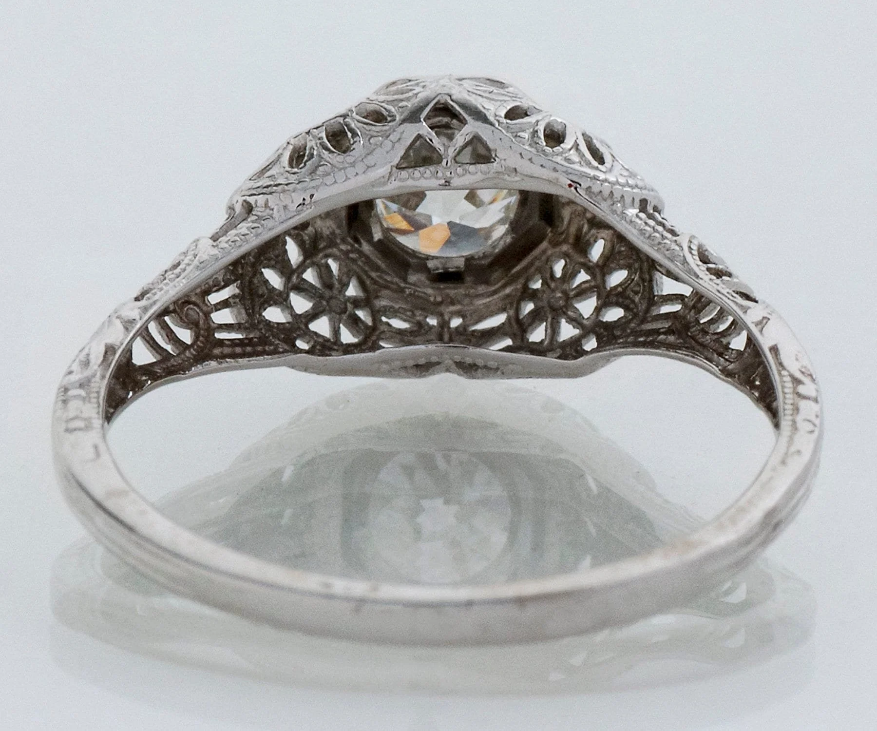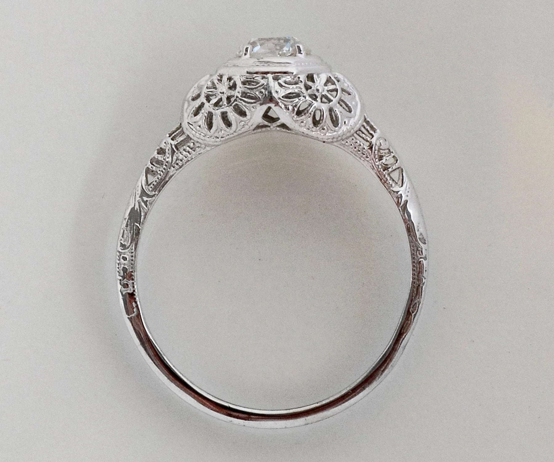 Antique Engagement Ring - Antique Edwardian 18k White Gold Filigree Diamond Engagement Ring Edwardian 18k White Gold European Cut Diamond =.50ct VS2/G Ring Size 6.5 (ring is sizable) Ring measures approximately 8.3mm at center, back of band is 1.3mm wide.
