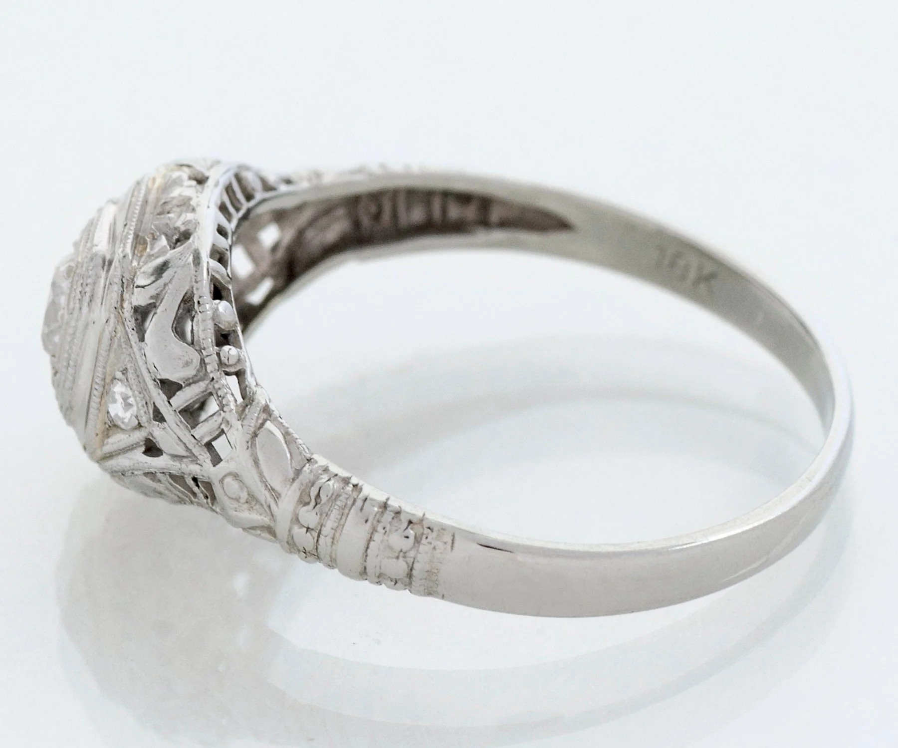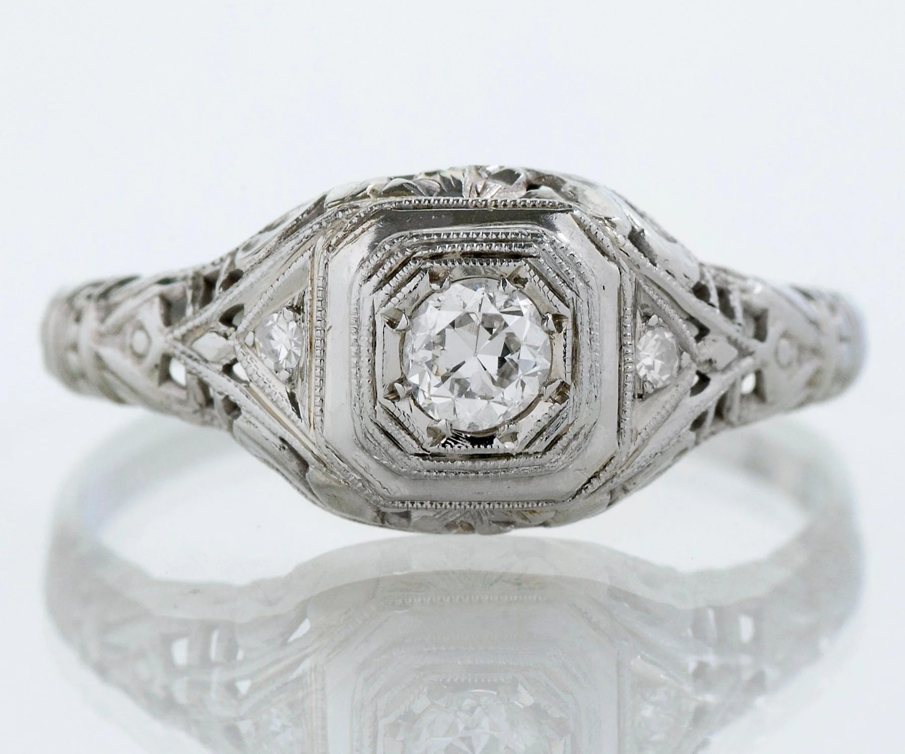 Antique Engagement Ring - Antique Edwardian 18 White Gold Filigree Diamond Engagement Ring Edwardian 18k White Gold European Cut Center Diamond =.20ct SI1/G 2 Side Diamonds =.03ct SI1/G Ring Size 6.75 (ring is sizable) Ring measures approximately 8.3mm at center, back of band is 2mm wide.