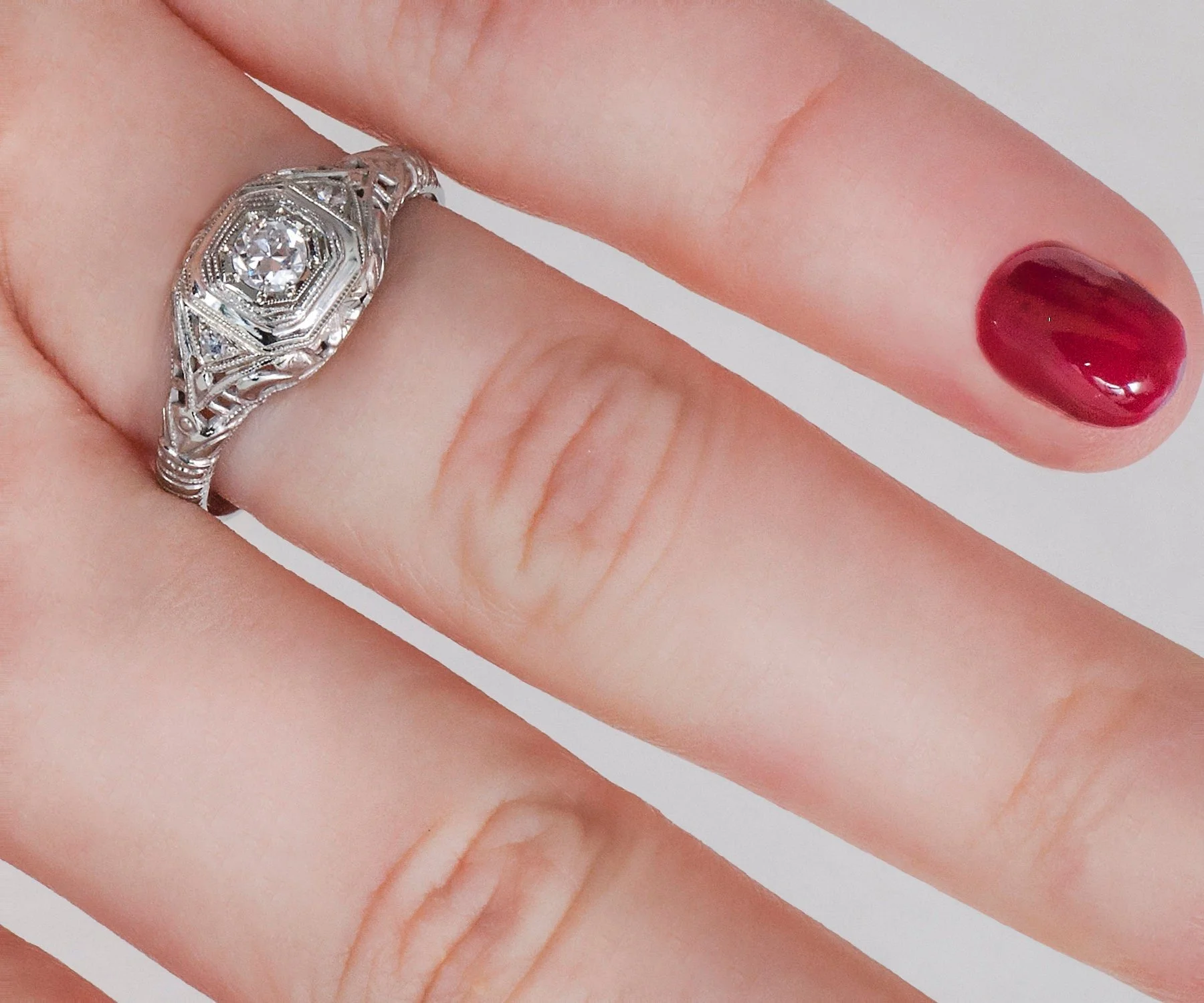 This darling Edwardian beauty is ready for its second debut! So many wonderful details make up this antique diamond engagement ring including lovely filigree work and fine milgrain. A European cut diamond sits nestled within its 8 prongs in an eye-catching octagonal setting crafted in 18 k white gold.