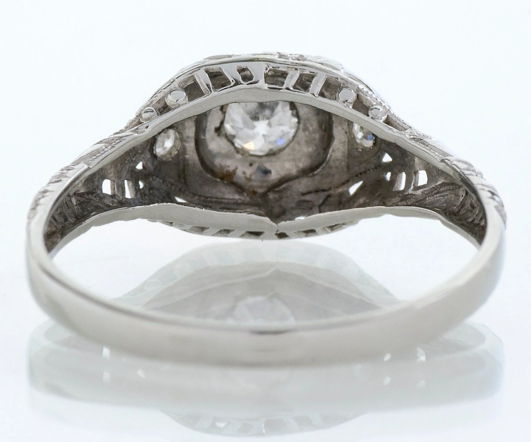 Antique Engagement Ring - Antique Edwardian 18 White Gold Filigree Diamond Engagement Ring Edwardian 18k White Gold European Cut Center Diamond =.20ct SI1/G 2 Side Diamonds =.03ct SI1/G Ring Size 6.75 (ring is sizable) Ring measures approximately 8.3mm at center, back of band is 2mm wide.