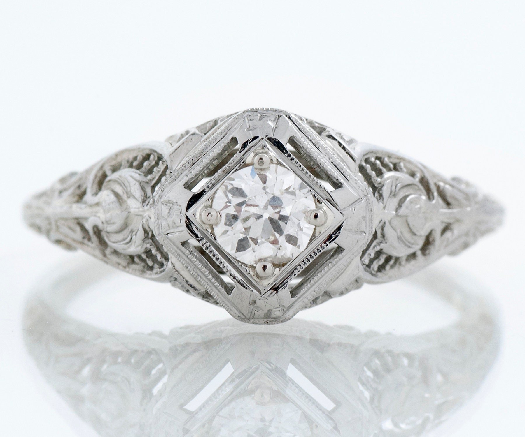 Antique Engagement Ring - Antique Edwardian 18k White Gold Filigree Diamond Engagement Ring Edwardian 18k White Gold European Cut Diamond =.24ct SI2/G Ring Size 5.5 (ring is sizable) Ring measures approximately 8.2mm at center, back of band is 1.3mm wide.