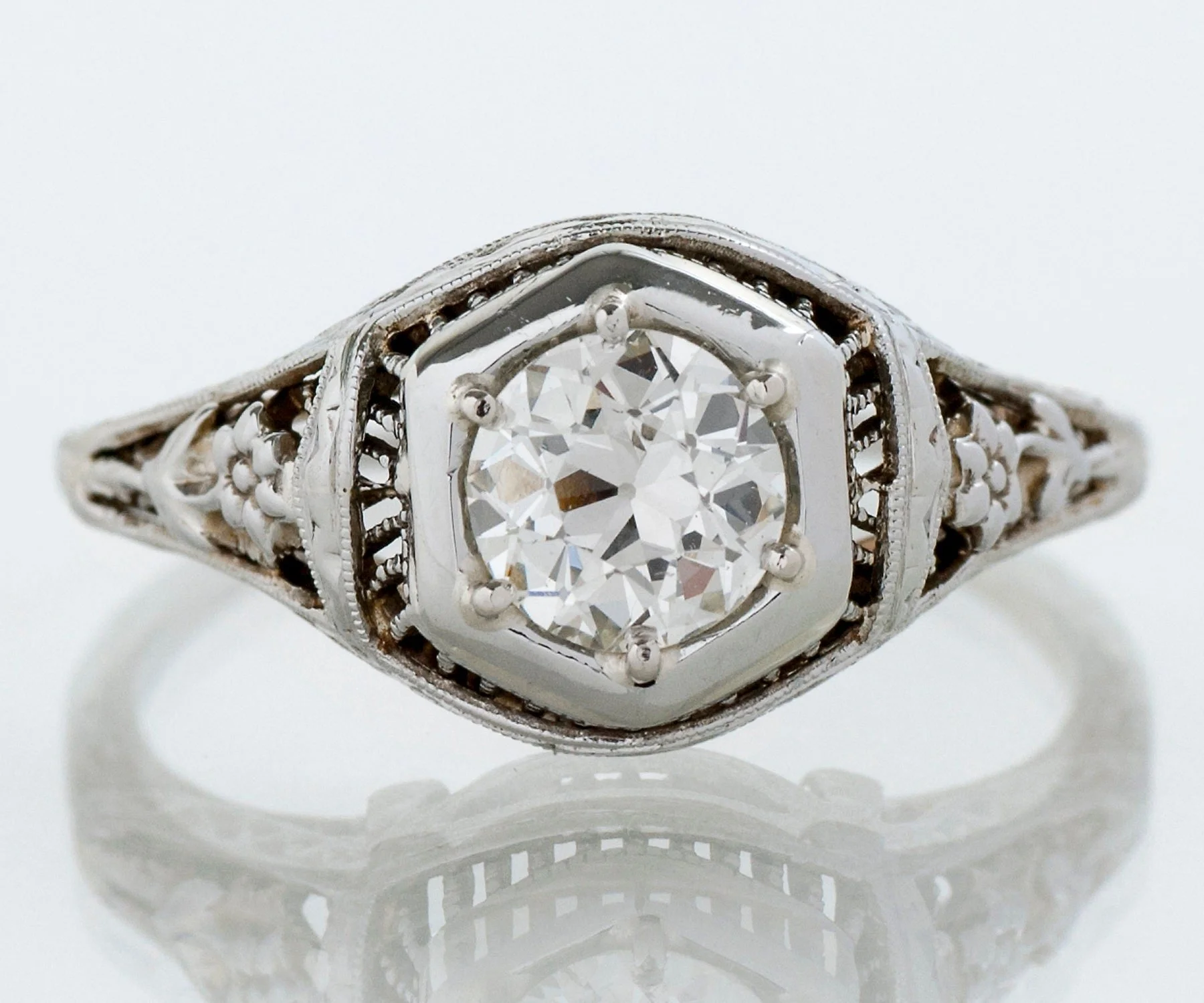 Filigree and flowers...what more do you need? This very romantic 18 k white gold antique Edwardian treasure of an engagement ring holds a GIA certified diamond at .61 carats. Beautiful from every angle.