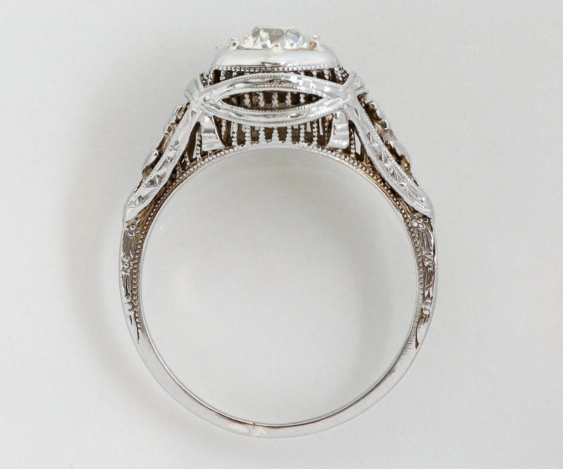 Antique Engagement Ring - Antique Edwardian 18k White Gold Filigree Diamond Engagement Ring Edwardian 18k White Gold European Cut Diamond =.61ct VS2/K (GIA Cert) Ring Size 6.5 (ring is sizable) Ring measures approximately 9.3mm at center, back of band is 1mm wide.