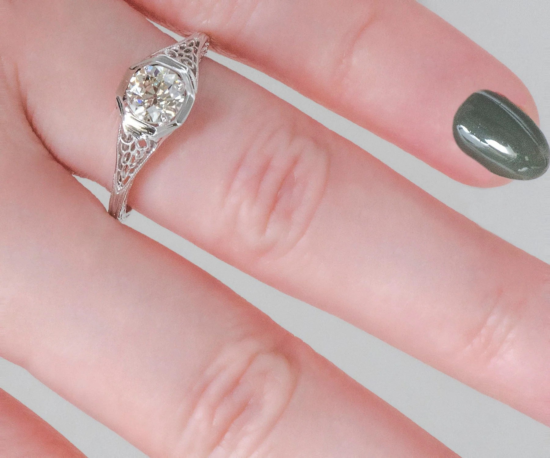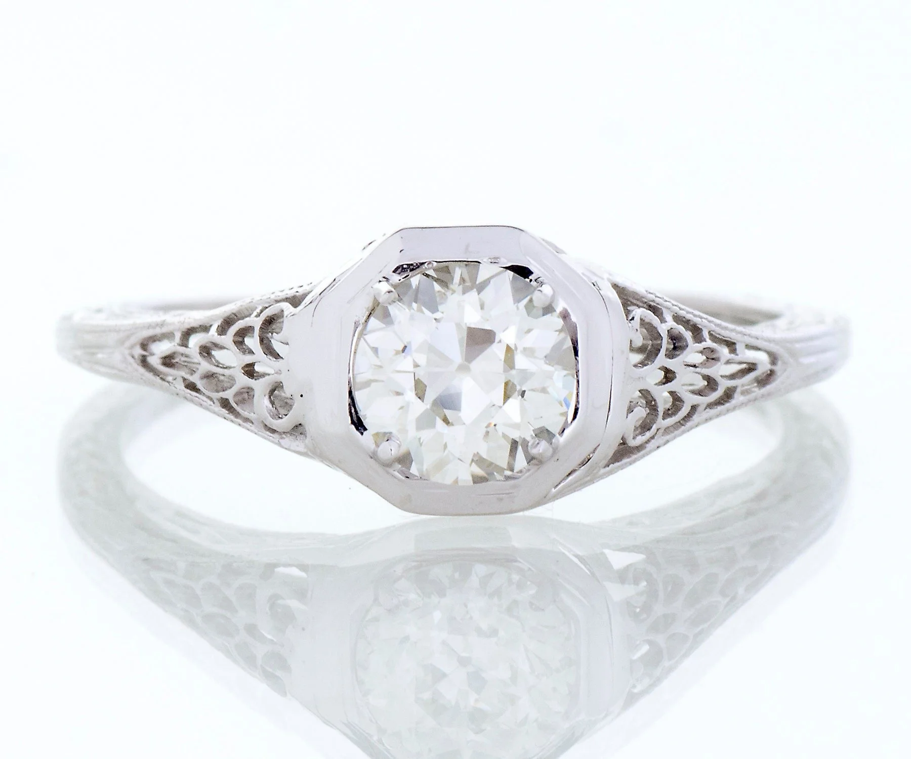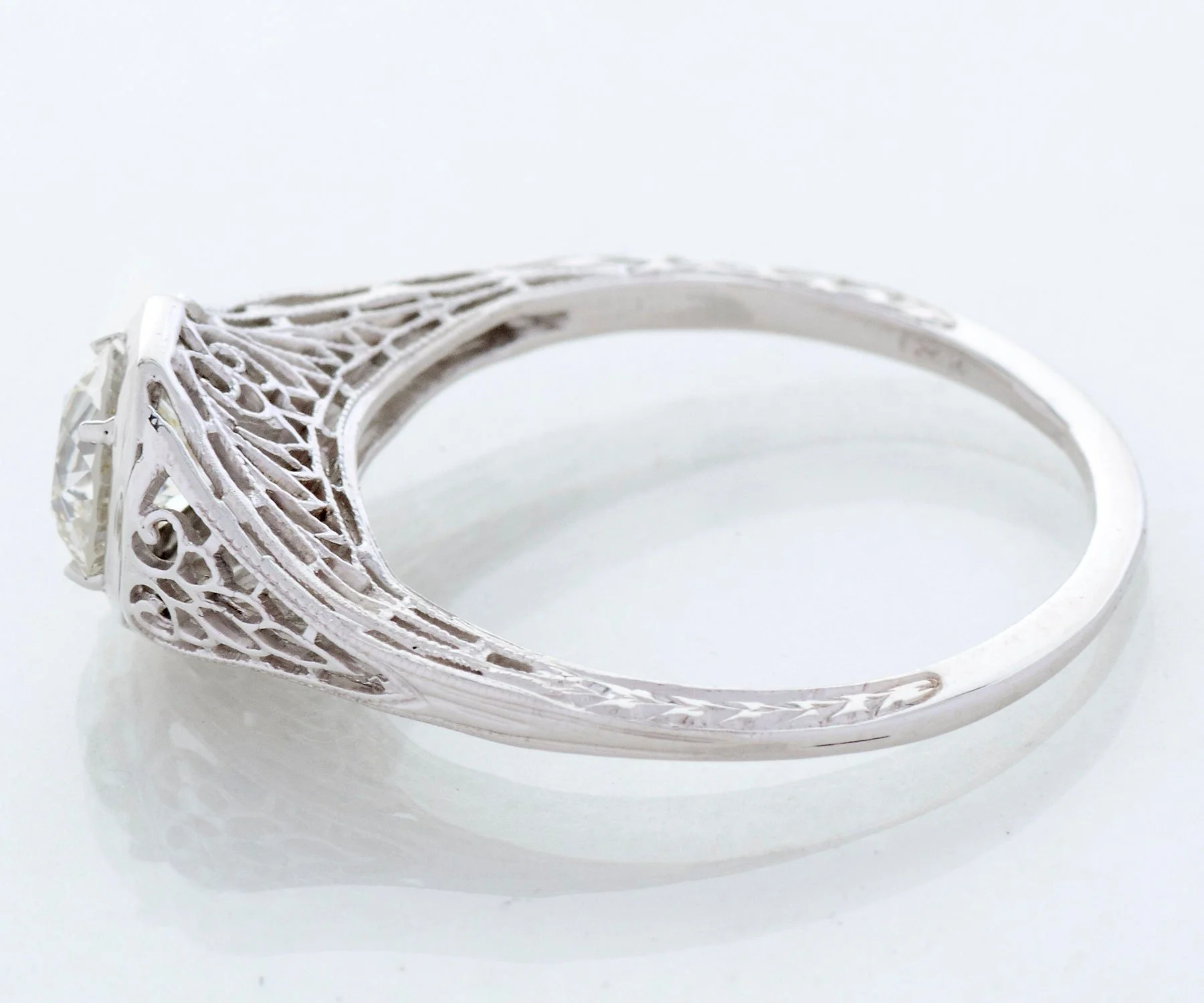 Antique Engagement Ring - Antique Edwardian 18k White Gold Filigree Diamond Engagement Ring 1910's 18k White Gold European Cut Diamond =.71ct VVS2/H Ring Size 6.75 (ring is sizable) Ring measures approximately 7.4mm at center, back of band measures 1.1mm in one direction and 1.3mm in the other.