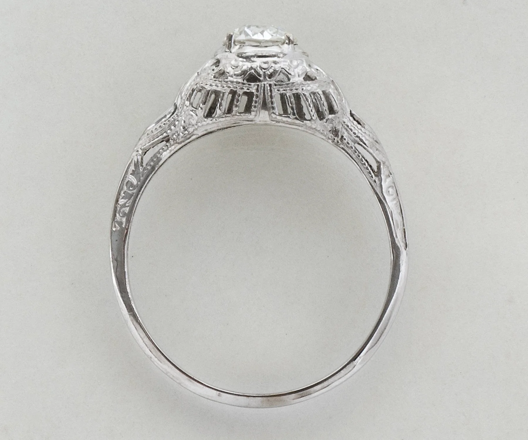 Antique Engagement Ring - Antique Edwardian 18k White Gold Filigree Diamond Engagement Ring Edwardian European Cut Diamond =.51ct VS1/H (GIA) Ring Size 7.75 (ring is sizable) Ring measures approximately 7.1mm wide at center, back of band is 1.7mm wide.