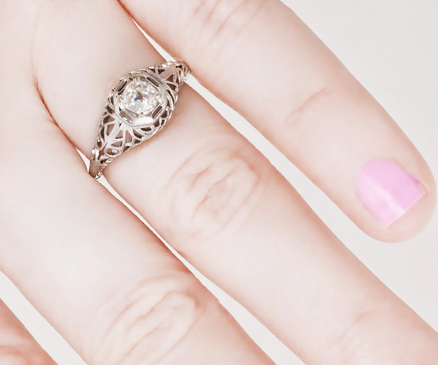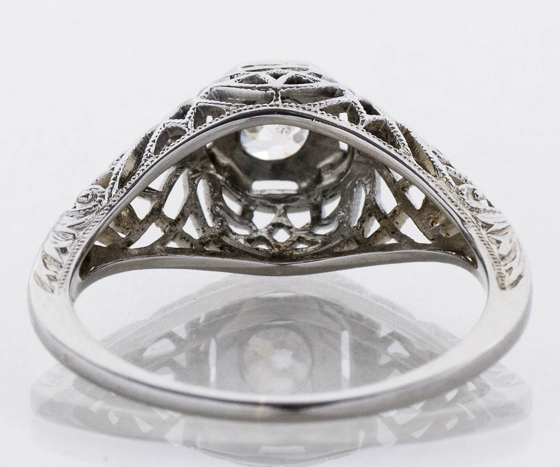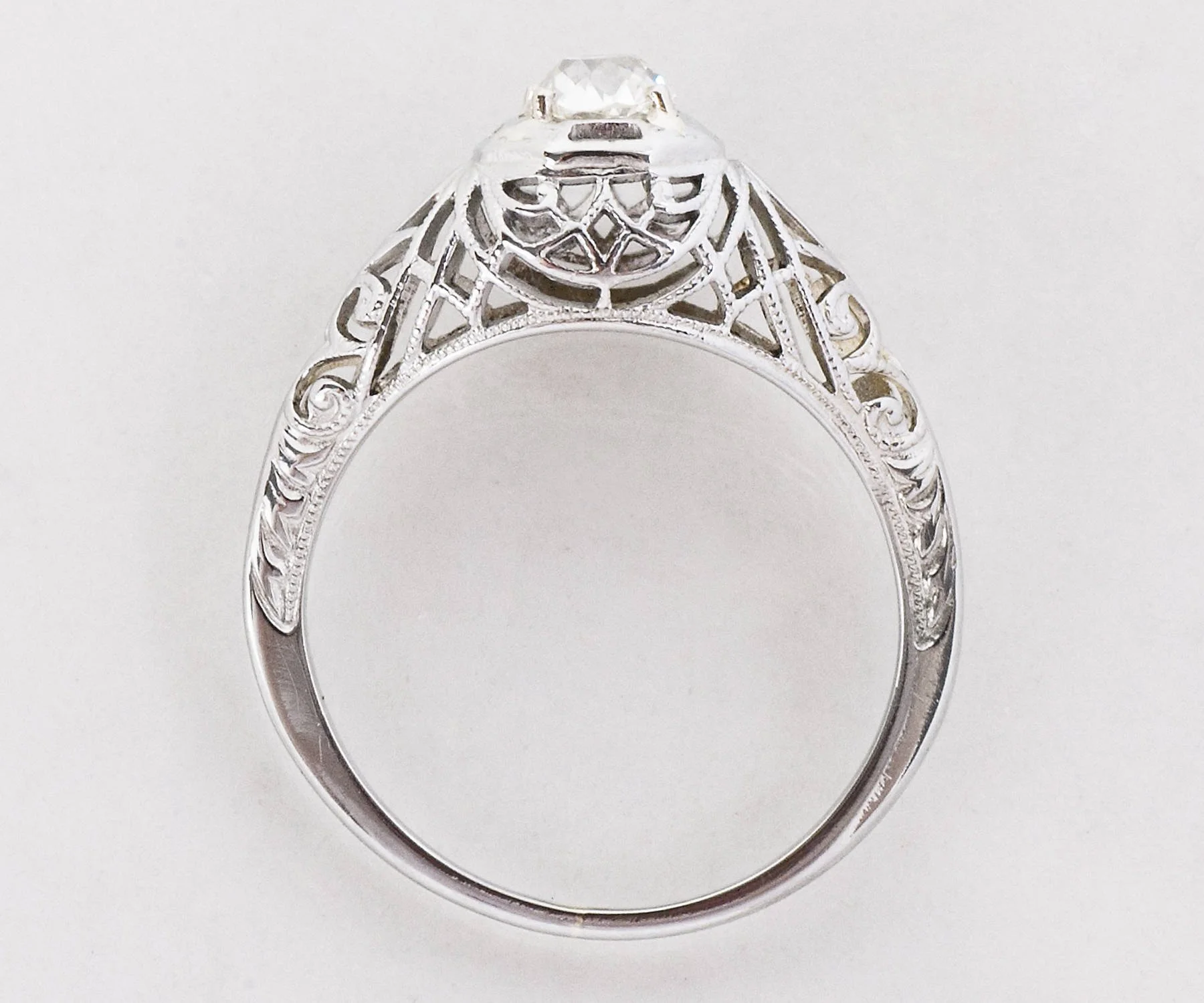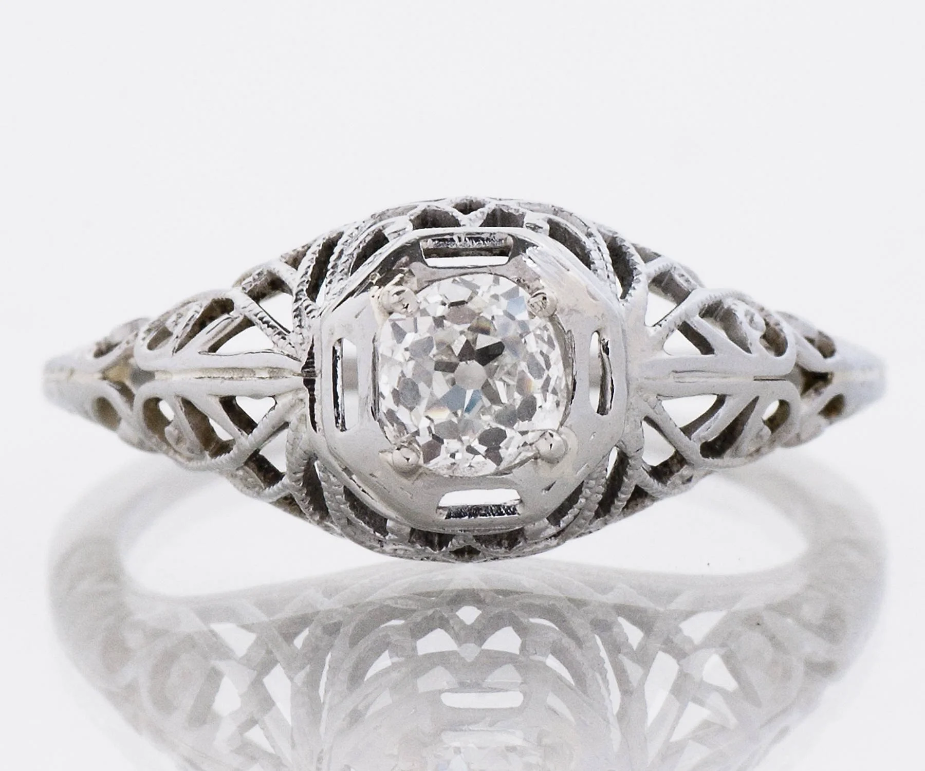 Antique Engagement Ring - Antique Edwardian 18k White Gold Filigree Diamond Ring 18k White Gold Filigree European Cut Diamond =.39ct VS1/G Ring Size 5 (ring is sizable) Ring measures approximately 8.1mm at center, band is 1.1mm wide.