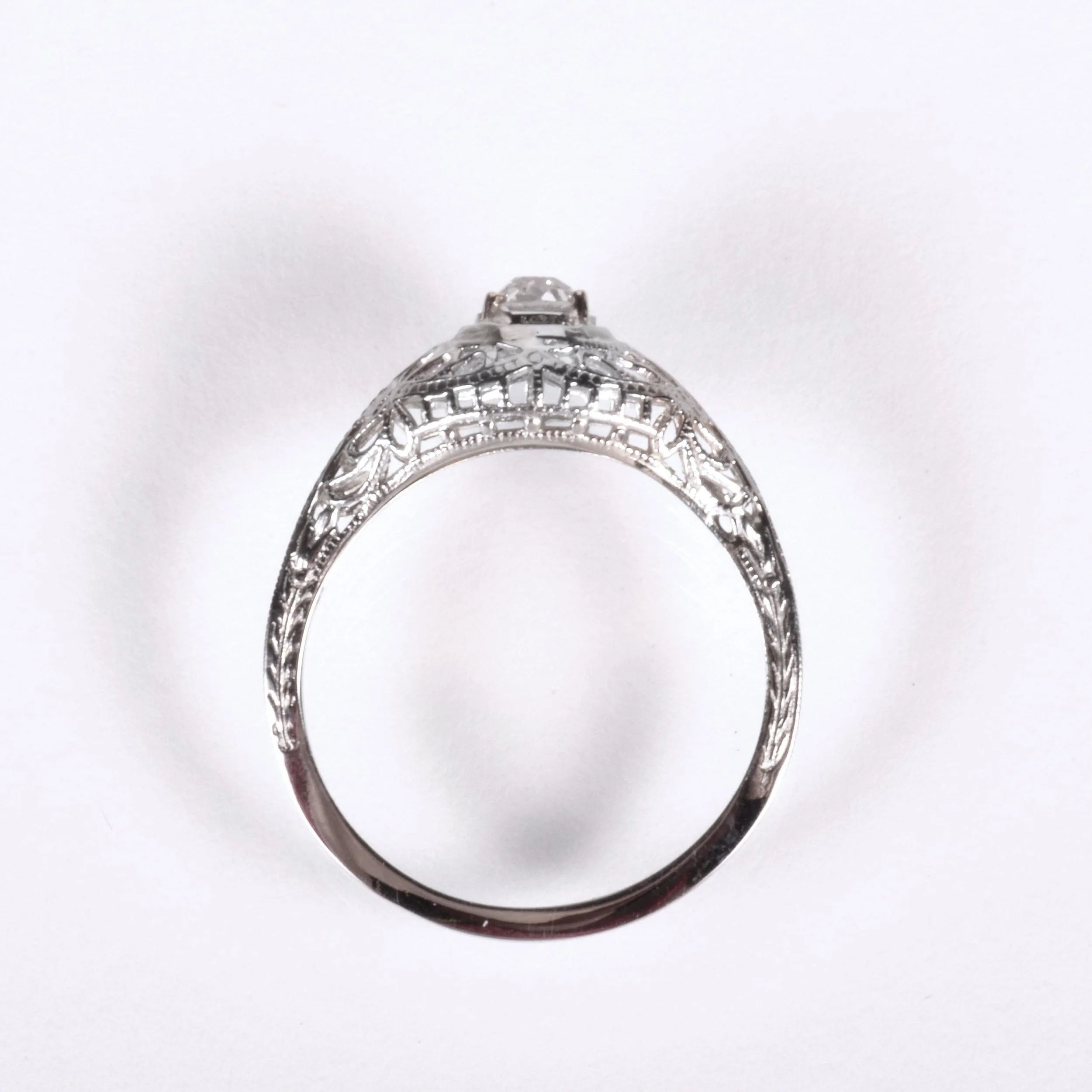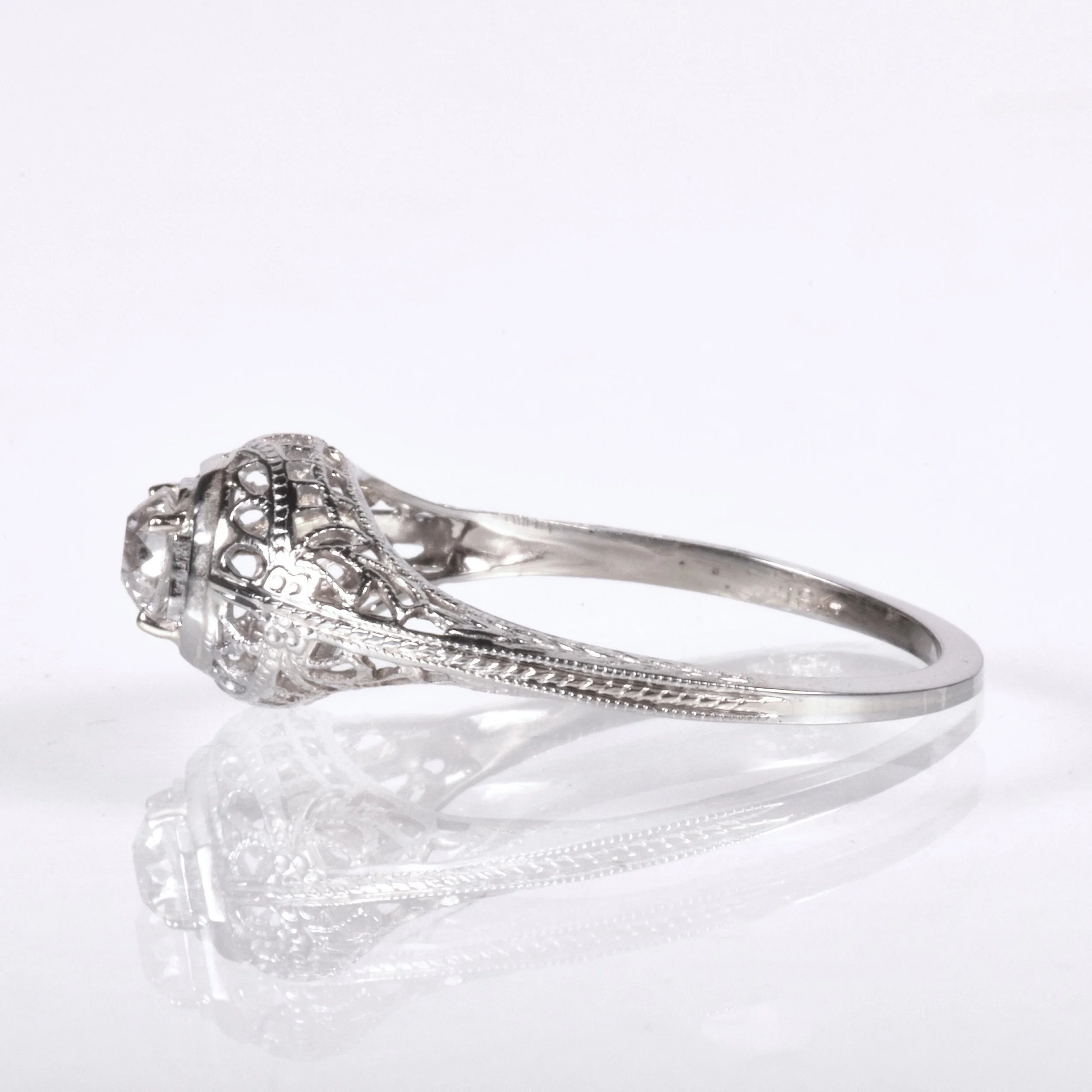 Antique Engagement Ring - Antique Edwardian 18k White Gold Filigree Engagement Ring 1910's Filigree 18k White Gold European Cut Center =.42ct VVS2/I Ring Size 7 (sizable) Ring measures approximately 7.9mm at center. Back of band measures 1.2mm wide with a 1.4mm rise.