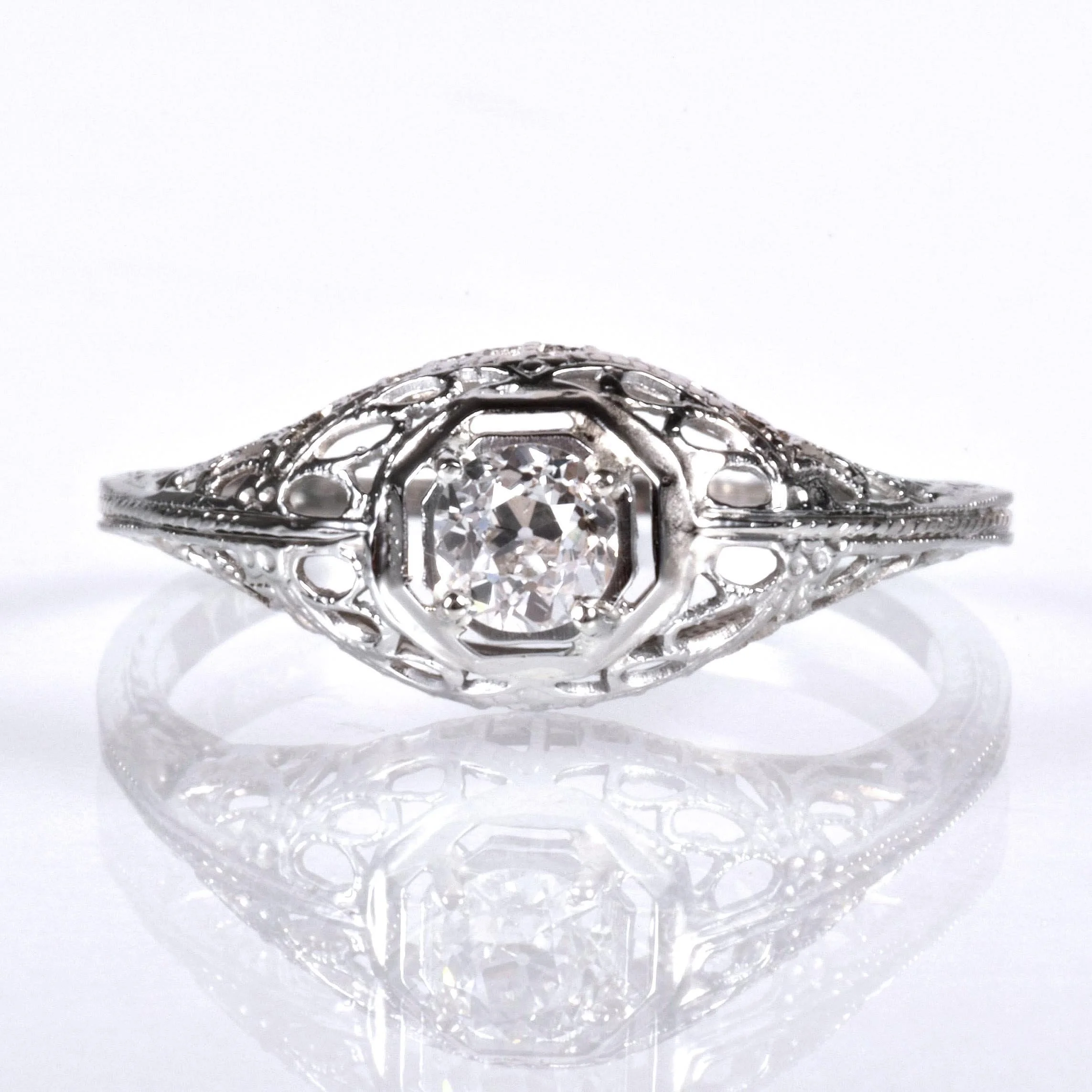 Antique Engagement Ring - Antique Edwardian 18k White Gold Filigree Engagement Ring 1910's Filigree 18k White Gold European Cut Center =.42ct VVS2/I Ring Size 7 (sizable) Ring measures approximately 7.9mm at center. Back of band measures 1.2mm wide with a 1.4mm rise.
