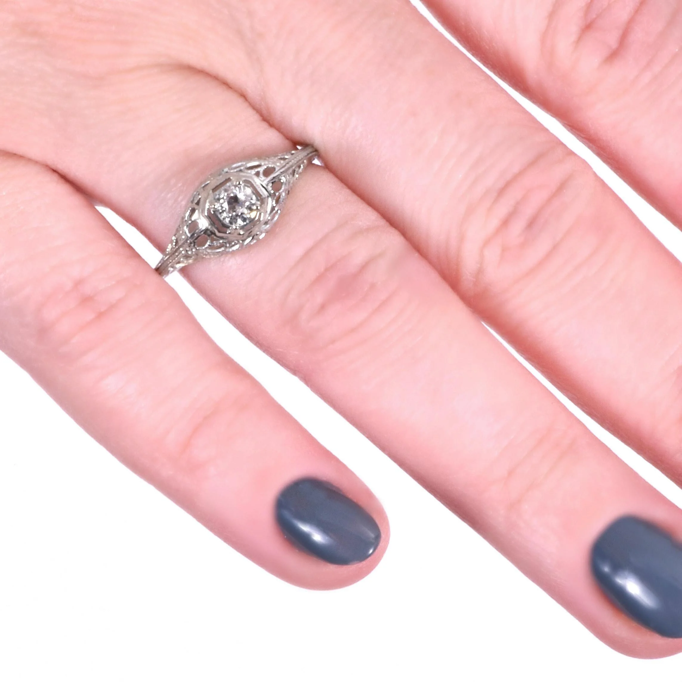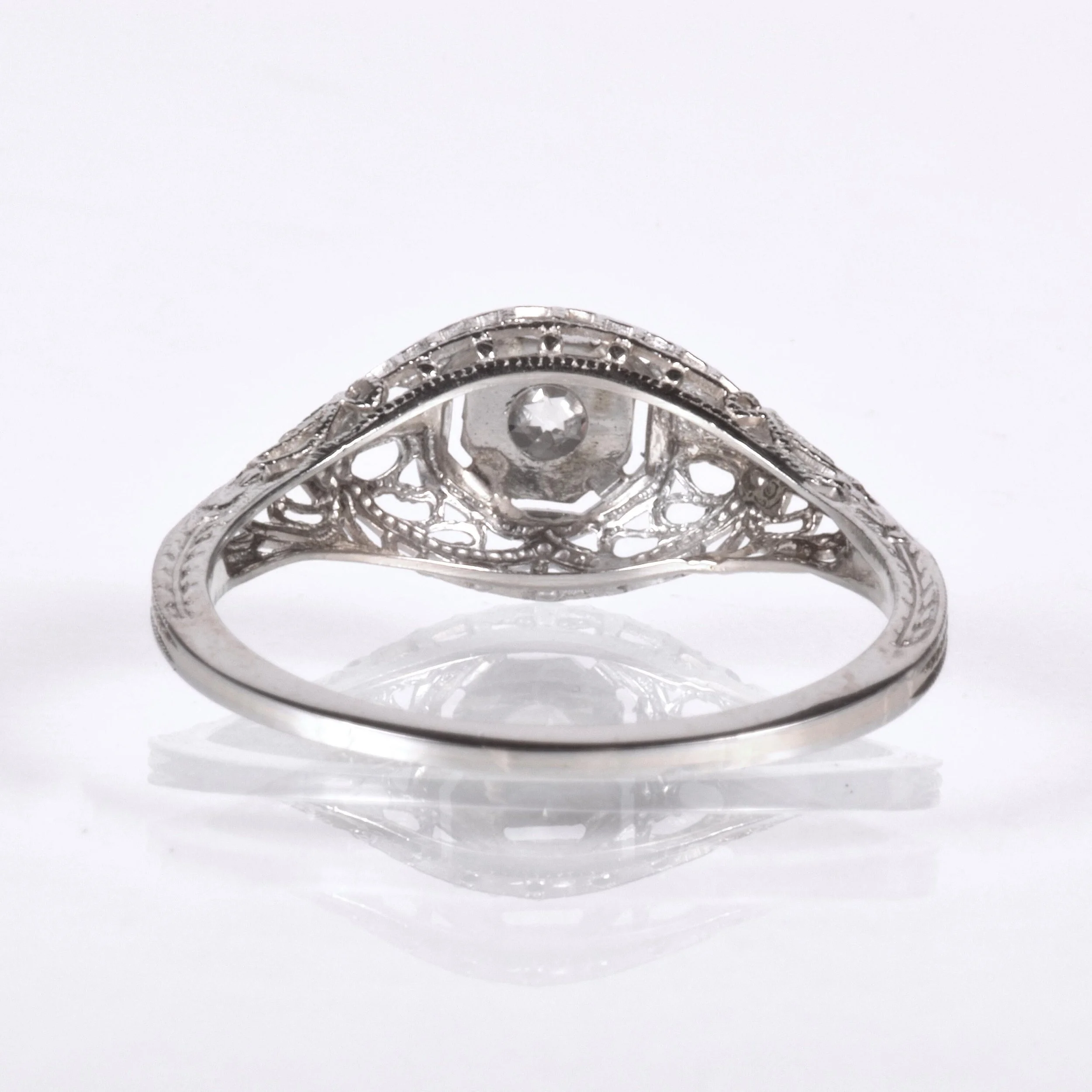 Antique Engagement Ring - Antique Edwardian 18k White Gold Filigree Engagement Ring 1910's Filigree 18k White Gold European Cut Center =.42ct VVS2/I Ring Size 7 (sizable) Ring measures approximately 7.9mm at center. Back of band measures 1.2mm wide with a 1.4mm rise.