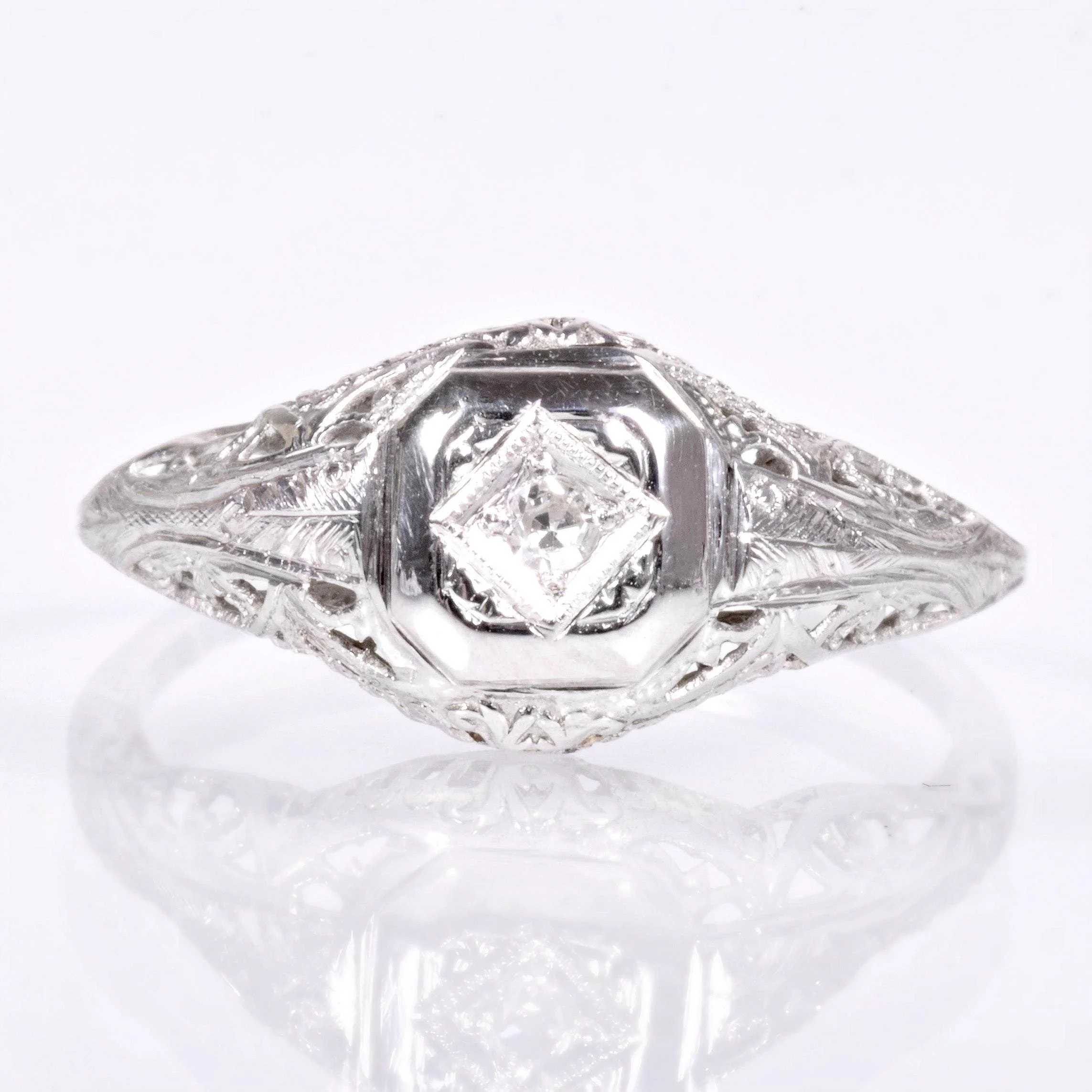 The demure nature of this little Edwardian charmer would lend itself as either a promise or engagement ring. Crafted in bright 18k white gold, a tiny gleaming diamond peeks from the center within a diamond shaped framework which is situated within a high polished square framework. This captivating beauty from the 1910's has an immense amount of fine detailing which can easily be viewed in our photos, such as fine milgrain, filigree and very crisp engraving.
