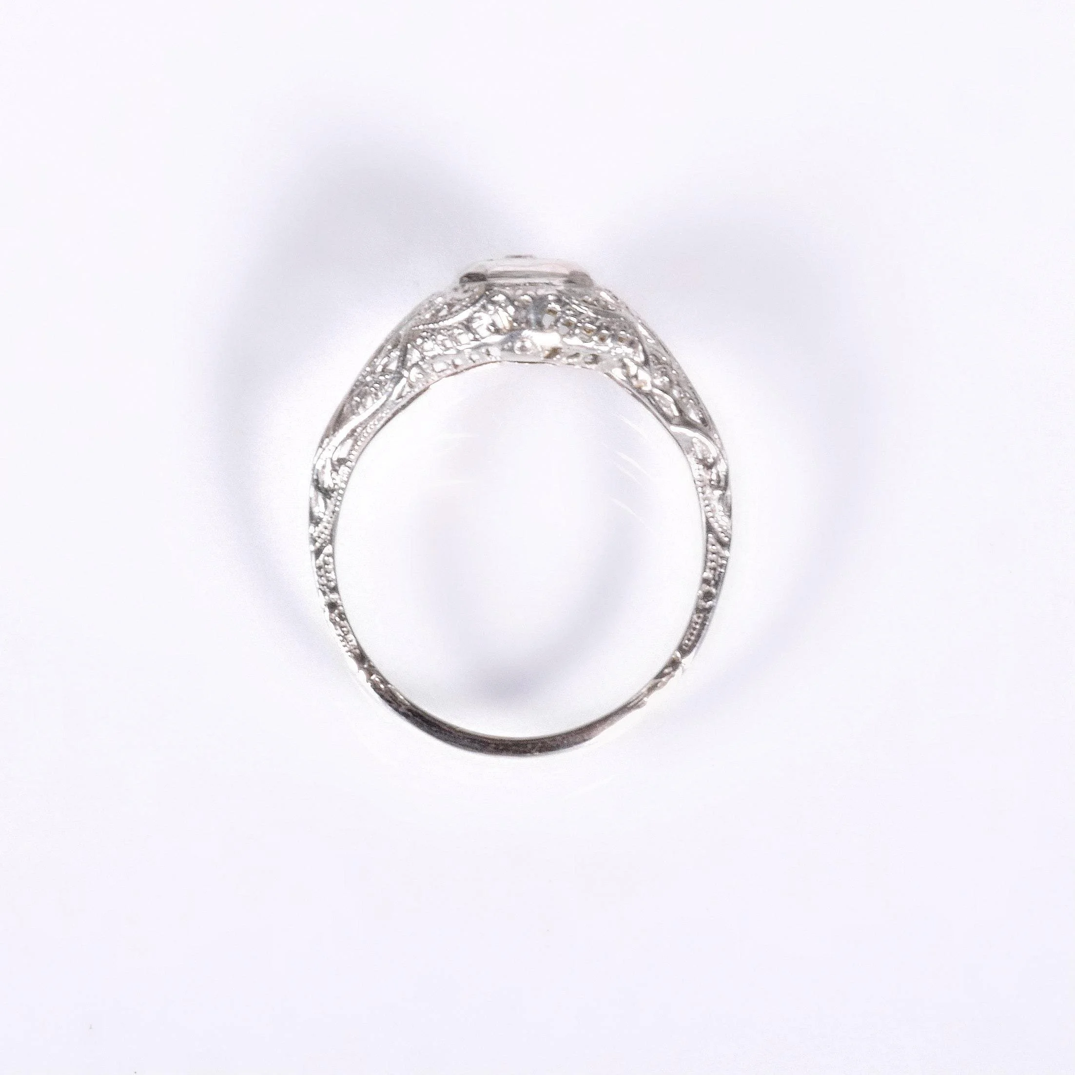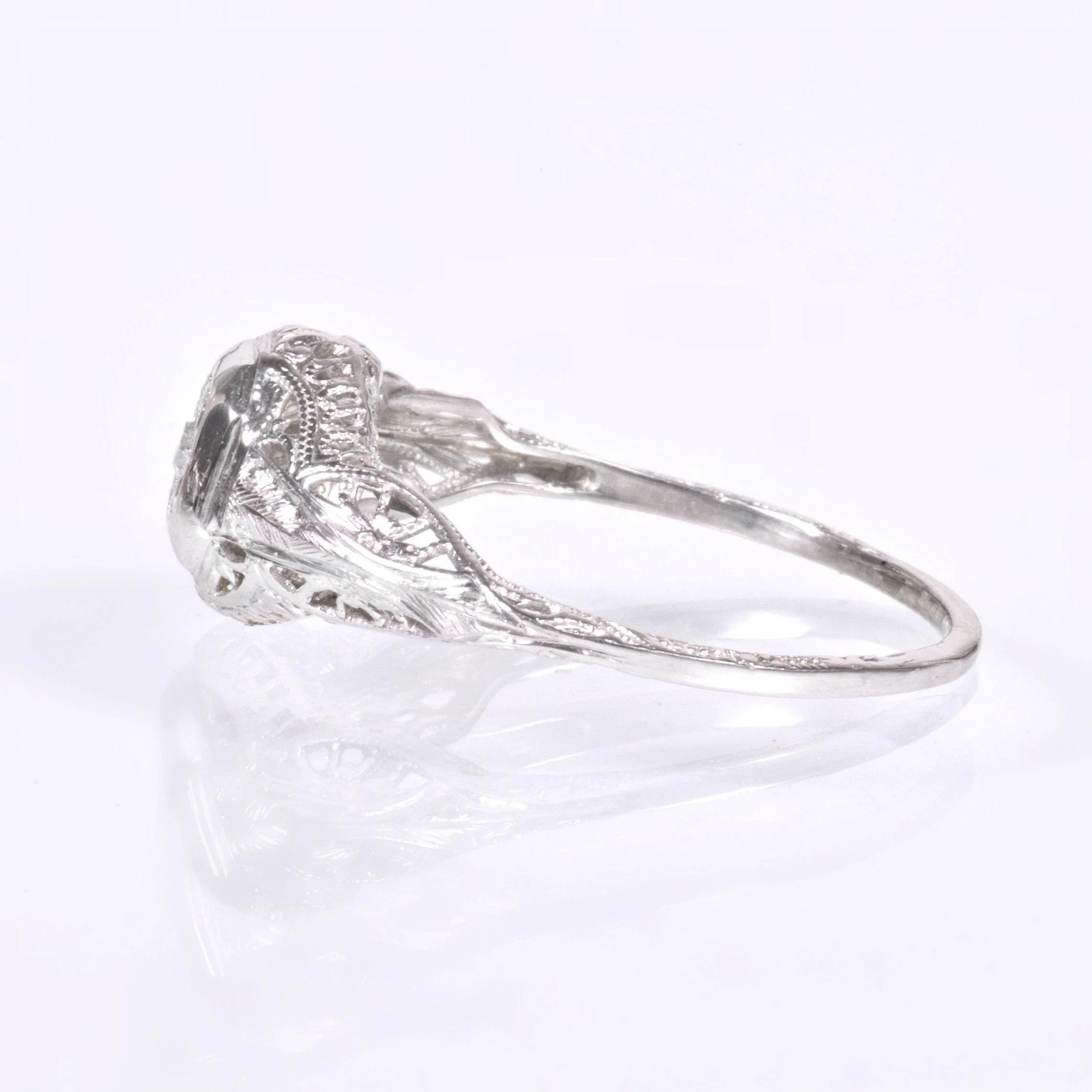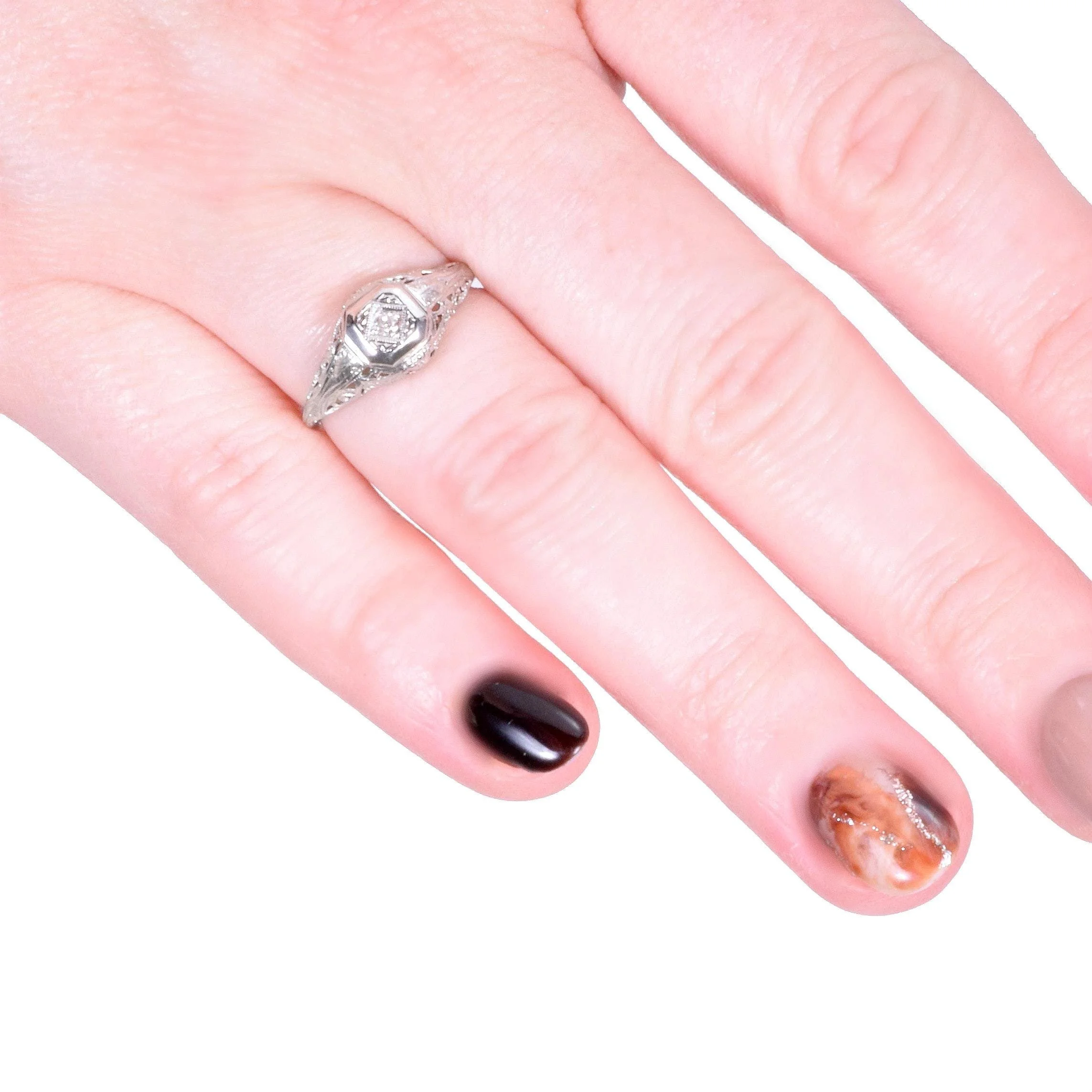 Antique Engagement Ring - Antique Edwardian 18k White Gold Filigree Promise Ring Circa 1910's 18k White Gold Single Cut Diamond =.04ct VS2/H Ring Size 5.5 (sizable) Ring measures approximately 8.2mm wide at center, back of band is 1mm wide.