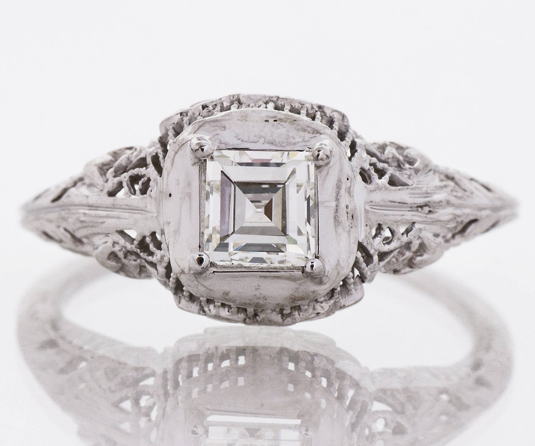 This is such a sweet little 18 k white gold treasure from the Edwardian era of jewelry making. This antique engagement ring has a stunning square step cut diamond at just under 1/2 ct. Surrounding this gorgeous center stone is fabulous framing and delicate filigree with applied flowers. A nice low profile and so pretty from all angles. This ring will pair beautifully with any one of our antique wedding bands.