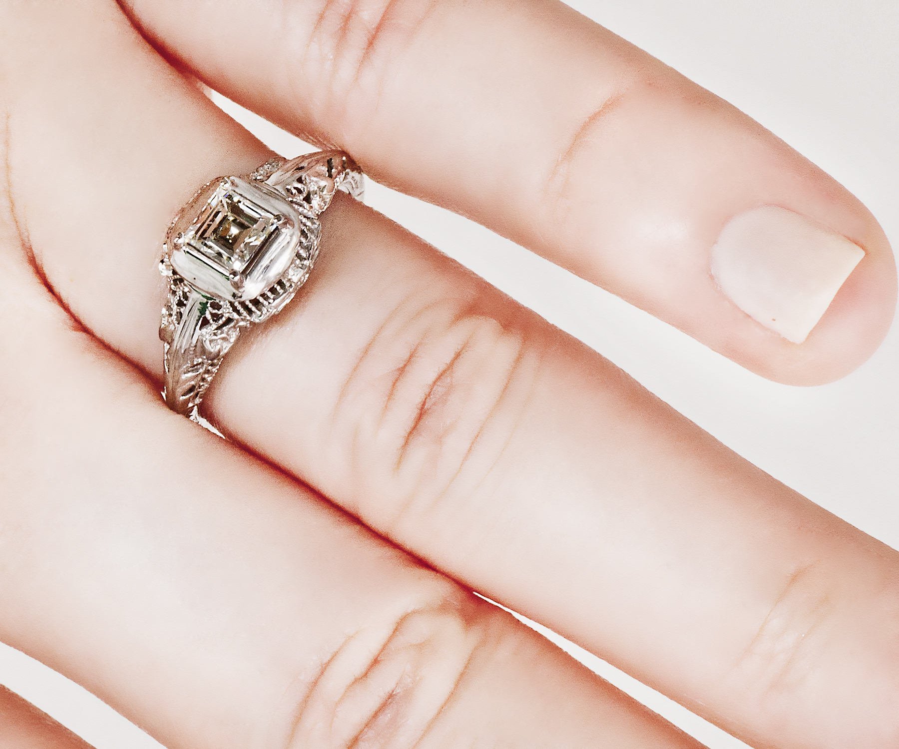Antique Engagement Ring - Antique Edwardian 18k White Gold Square Diamond Engagement Ring Edwardian 18k White Gold Square Step Cut Diamond =.48ct VS1/H Ring Size 5 (ring is sizable) Ring measures approximately 8.6mm at center, back of band is 1.1mm wide.