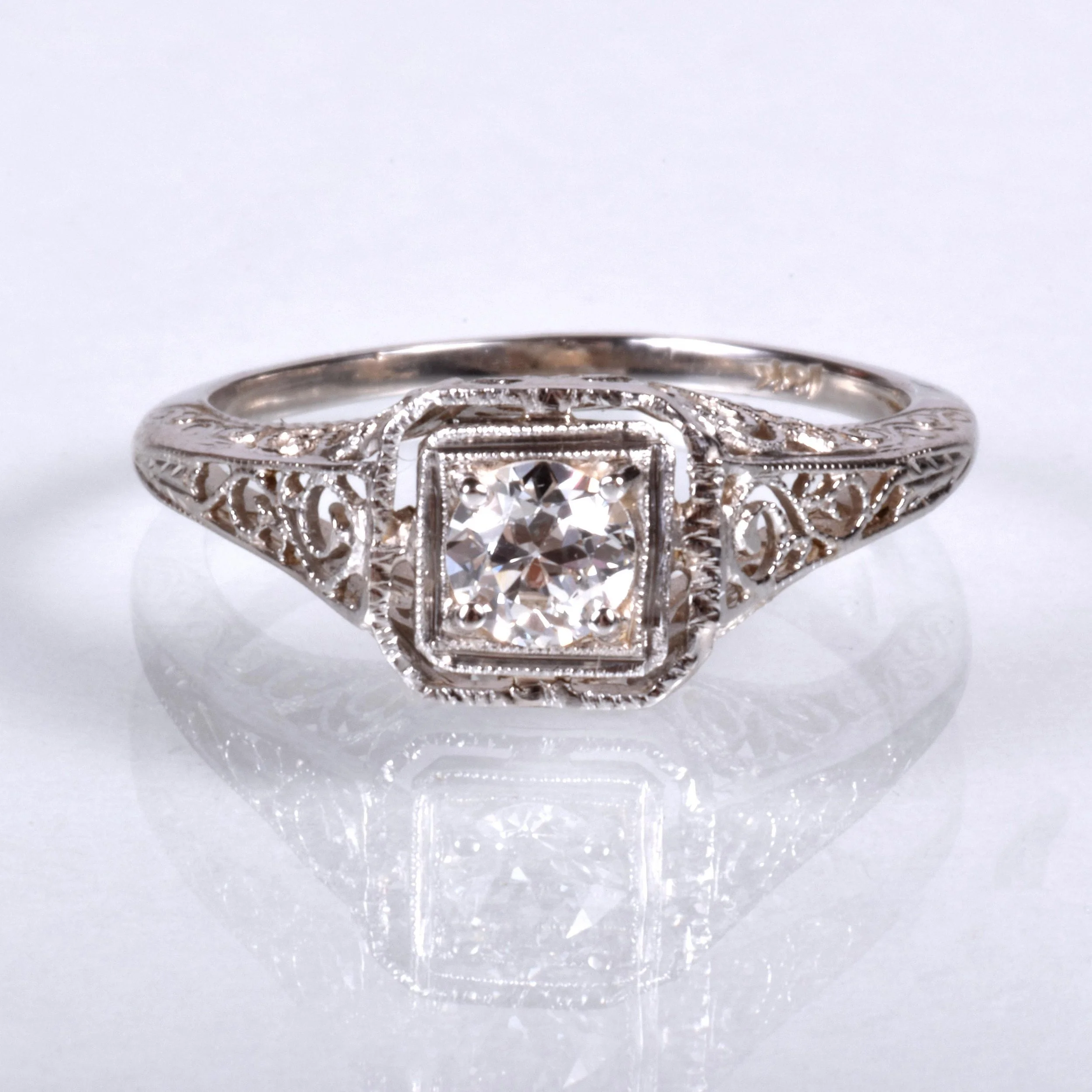 Antique Engagement Ring - Antique Edwardian 18k white Gold Swirled Filigree Engagement Ring 18k White Gold Edwardian European Cut Diamond =.30ct VS2/G Ring Size 5.75 (sizable) Ring measures approximately 7.5mm at center, back of band is 1.3mm wide.
