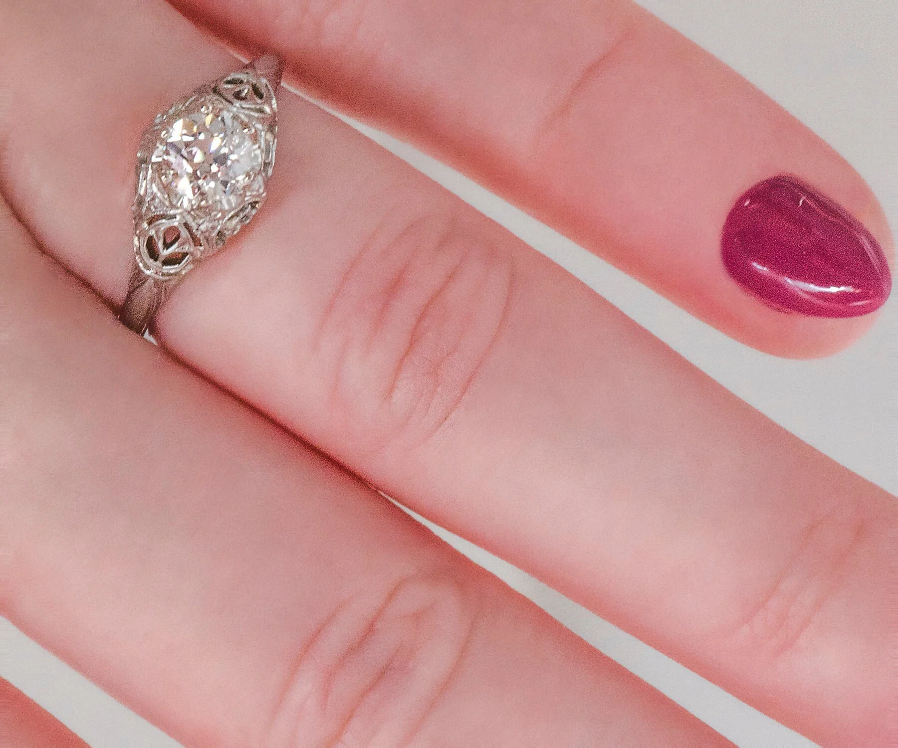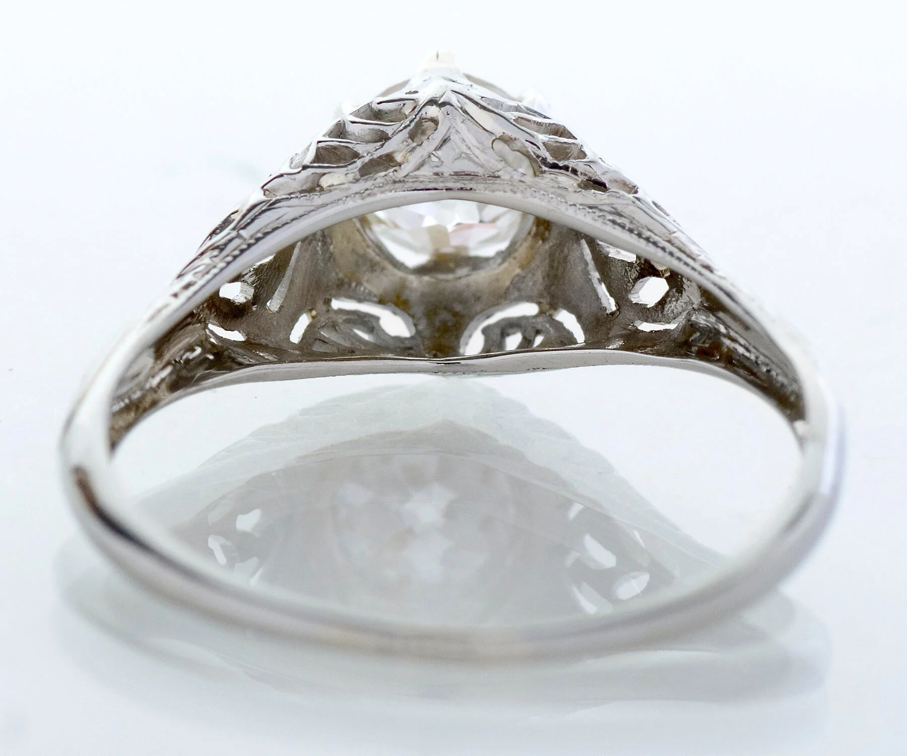 This lovely Belais antique diamond engagement ring is quite ready to begin its second romantic life with you! Owning a highly collectible and coveted Belais ring is really like wearing a piece of jewelry history because the company which began in 1873 is considered to be one of the first US manufacturers to use white gold and they came up with their very own formula in 1917. It was sometimes referred to as "Belais Metal". A very fine European cut diamond sits proudly at the center of this gloriously detailed setting which is simply gorgeous from every angle!