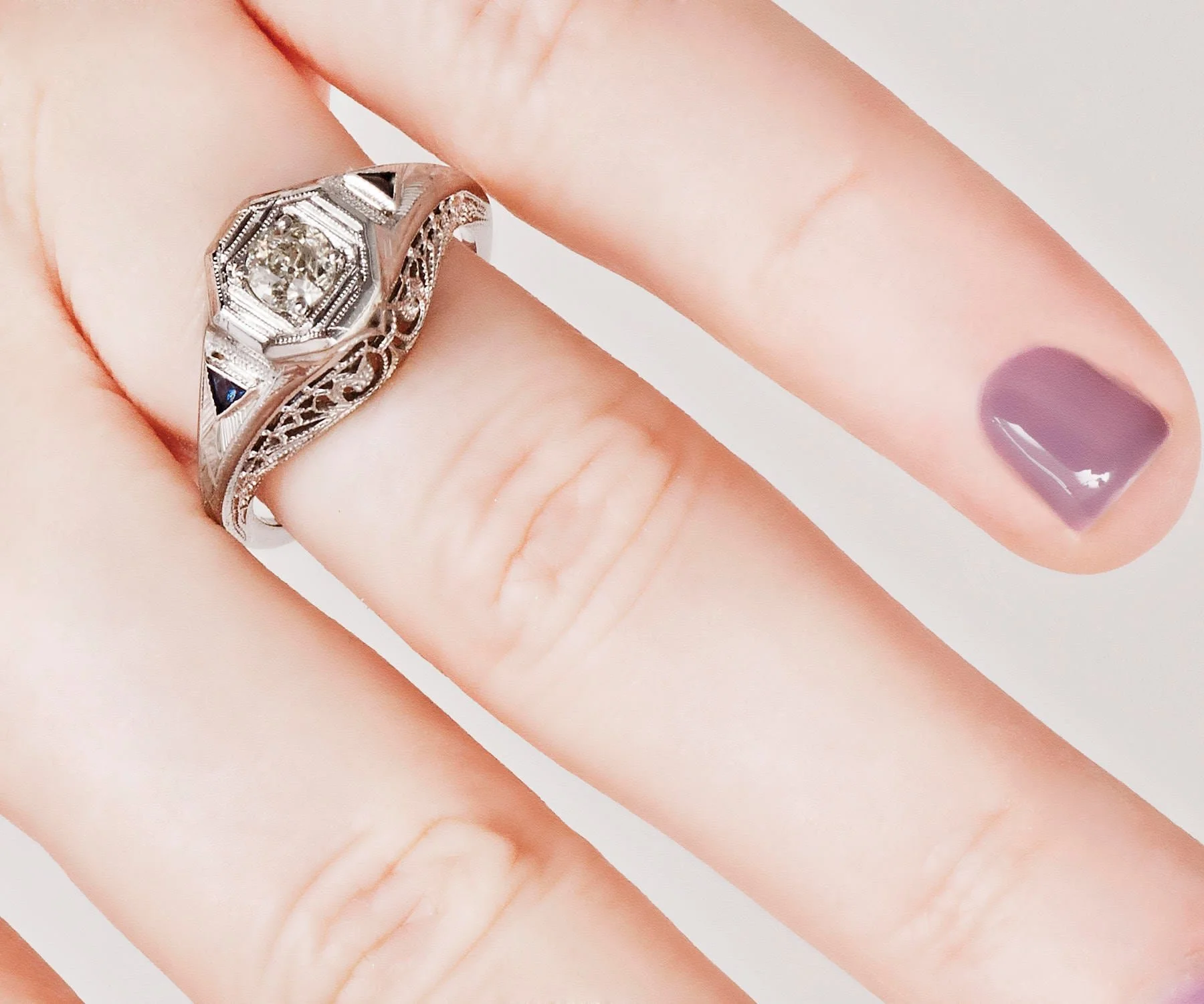 Get engaged with this lovely Edwardian platinum and diamond engagement ring with just the right amount of fine filigree work. Two bright blue synthetic sapphires flank either side of the lovely center 1/4 carat European cut diamond. The engagement ring is pretty from all angles!