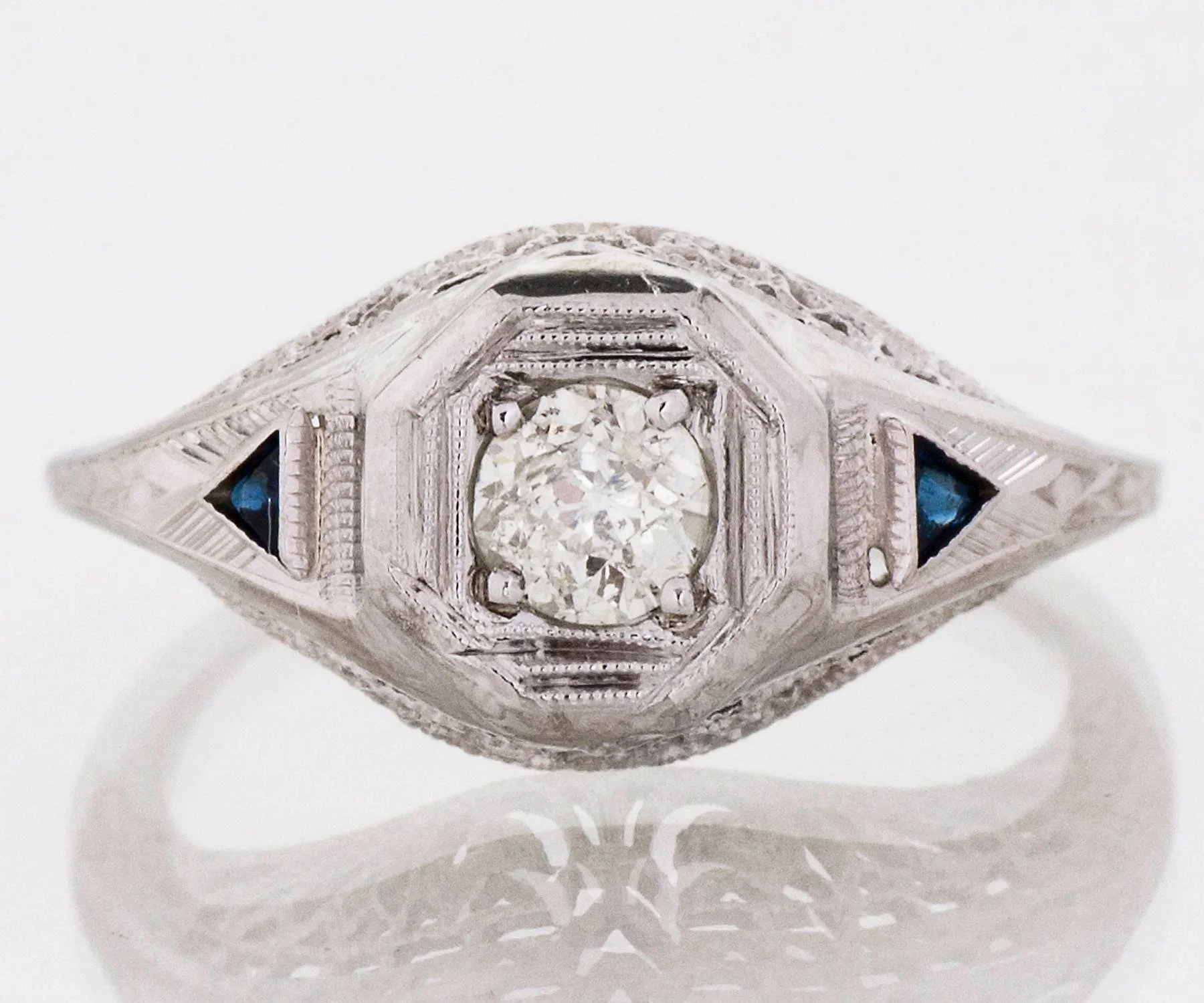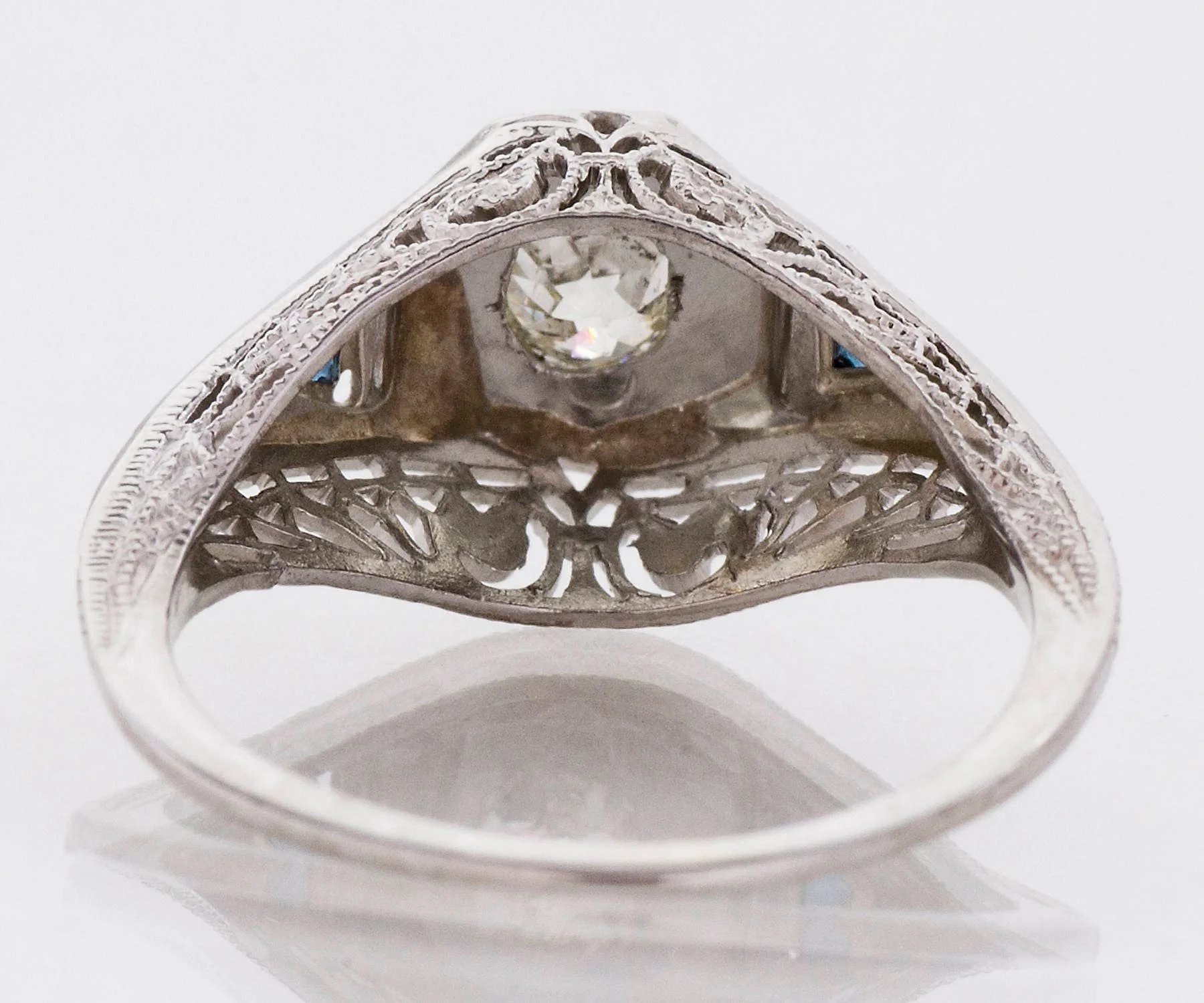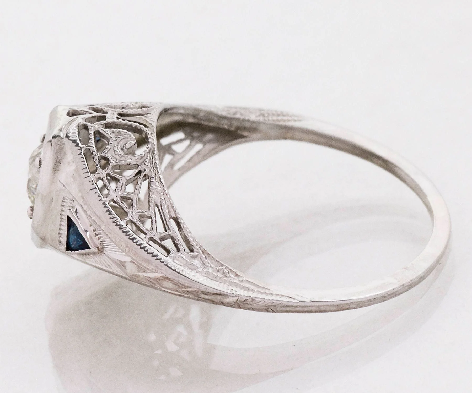 Antique Engagement Ring - Antique Edwardian Platinum Filigree Diamond Engagement Ring 1910's Platinum European Cut Diamond =.25ct I1/I-J 2 Synthetic Blue Sapphires Ring Size 5.75 (ring is sizable) Ring measures approximately 9.5mm at center. Back of band measures .8mm in one direction and 1.1mm in the other.