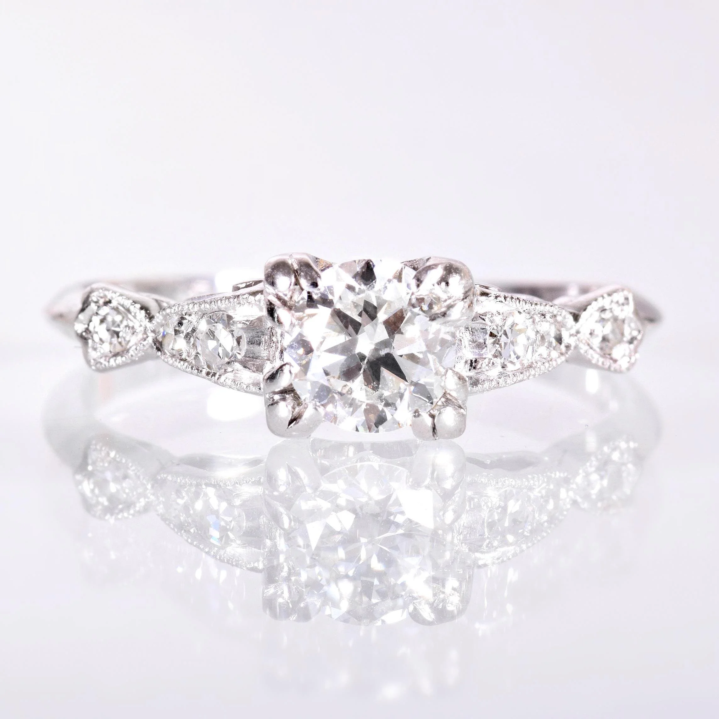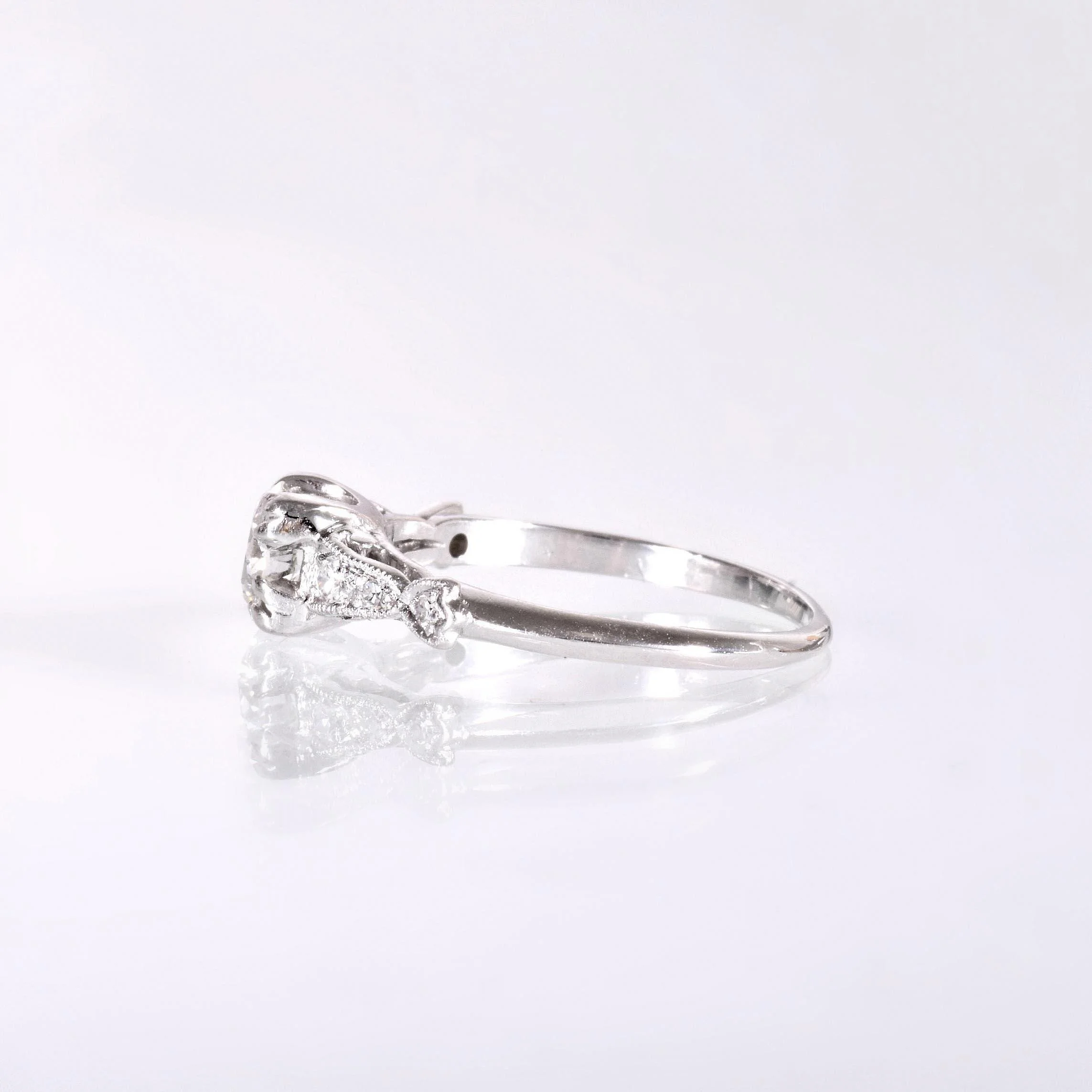 This classic platinum diamond engagement ring is from the decadent Art Deco era of the 1920s. This timeless design proudly holds a dazzling .46 carat European cut diamond with six adorning side diamonds on either side going down half of the band. Would look sensational paired with an engraved or diamond antique wedding band. If you're looking for the elegance of yesterday with the lasting classics of platinum and diamonds, this ring is for you!