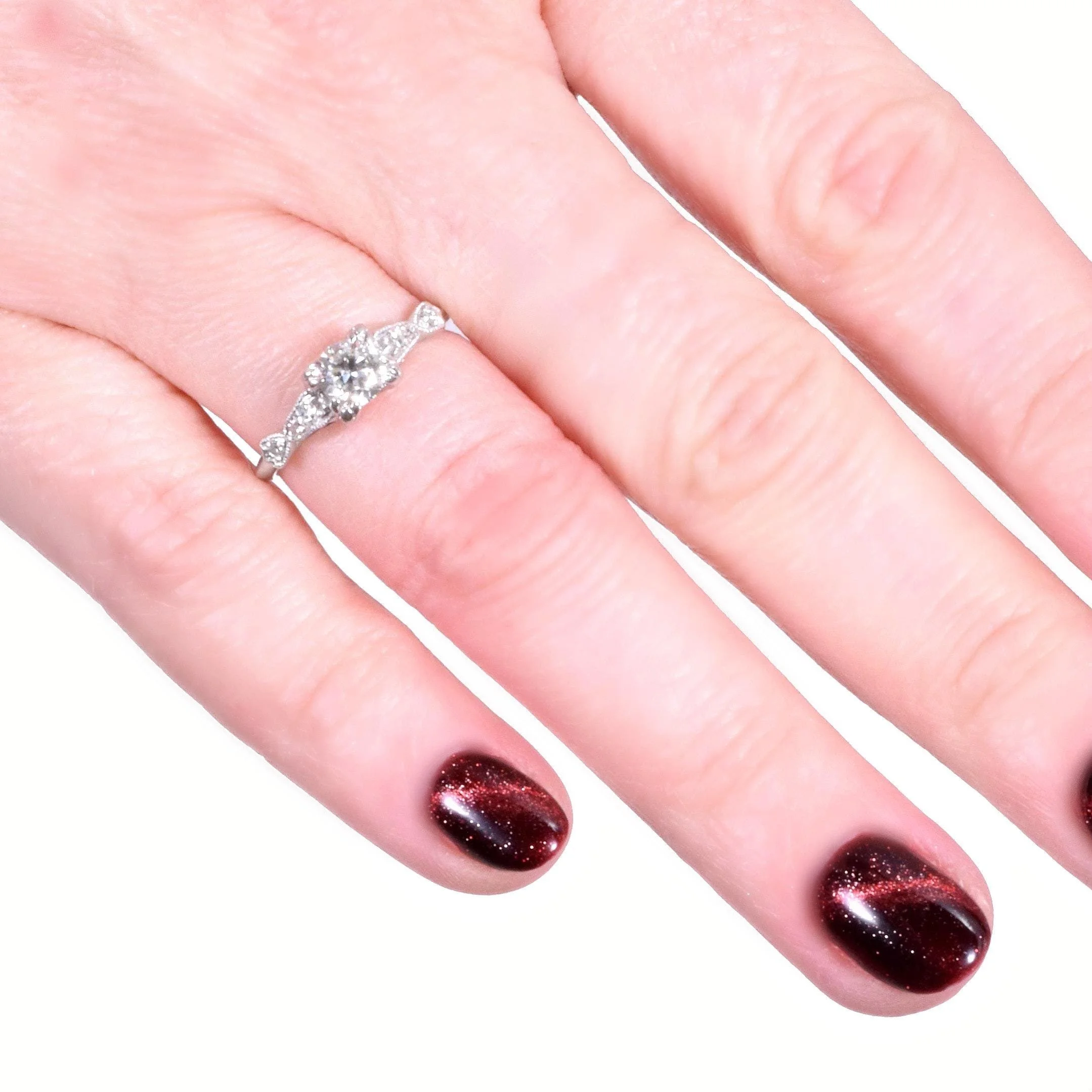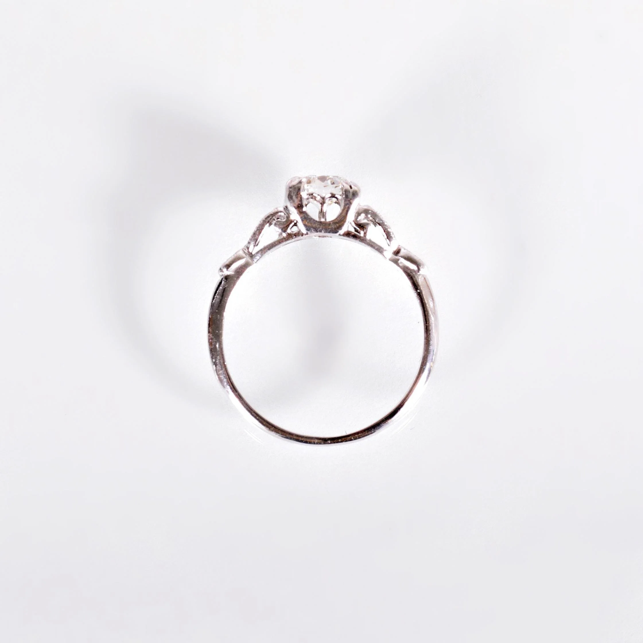 Antique Engagement Ring - Antique Platinum Diamond Engagement Ring Circa 1920's Platinum European Cut Diamond =.46ct VS1/G 6 Single Cut Diamonds =.08ct VS/G-H Ring Size 5.5 (sizable) Ring measures approximately 5.4mm wide at center, back of band is 1.4mm wide.