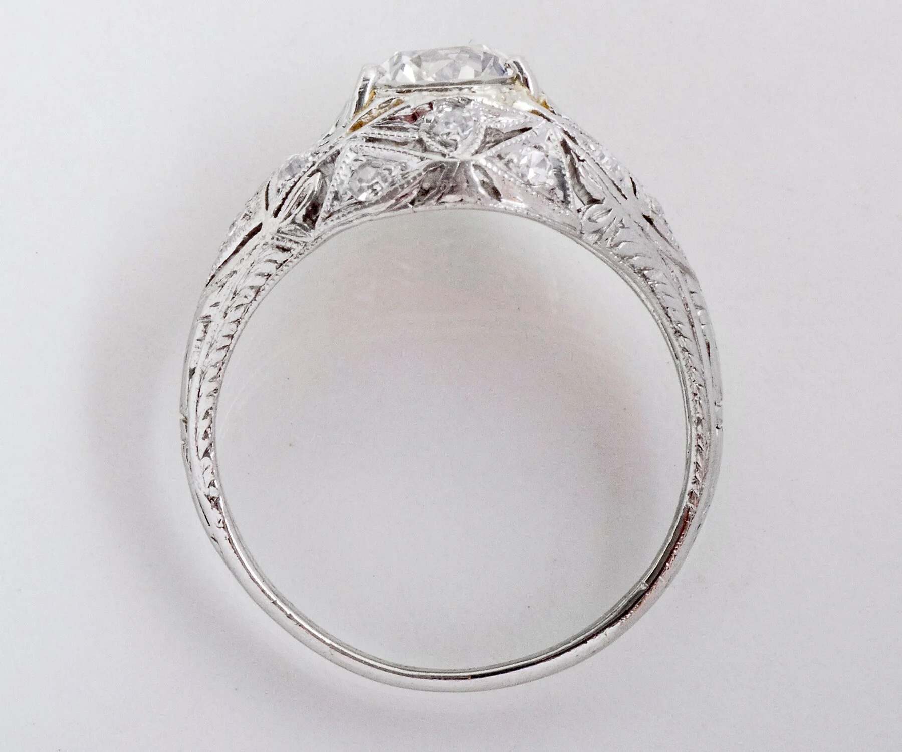 So many ornate and interesting details encompass this dreamboat of an antique diamond engagement ring created in platinum. The Art Deco jewelry design period showcased geometric, airy designs which is seen here in this exquisite ring. Carrying a gorgeous center European cut diamond and adorned all around by 12 more tiny European cut diamonds emitting extra glimmer throughout. Dated 1927, this beauty has already lived a long, healthy life. Could this be symbolic of your future nuptials?