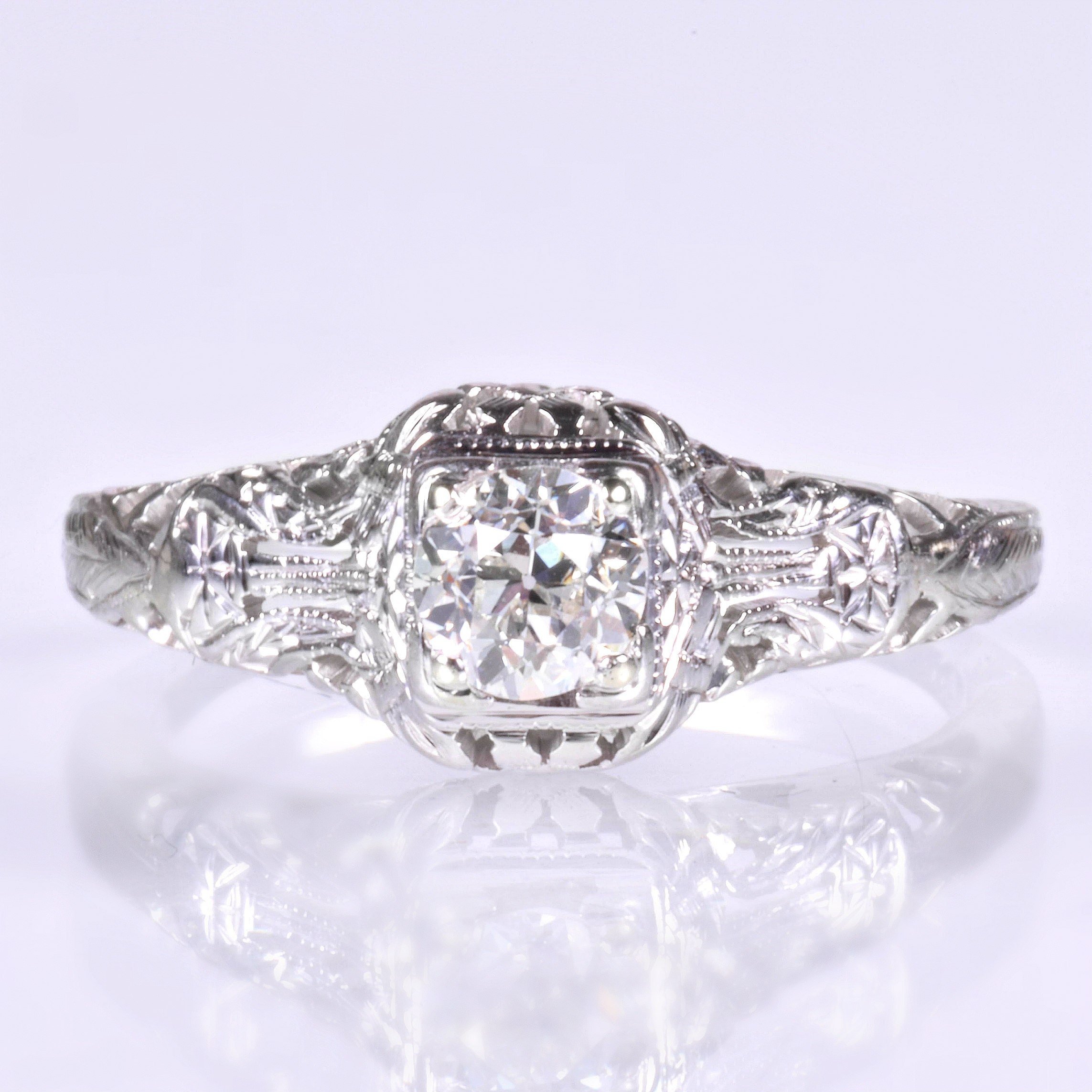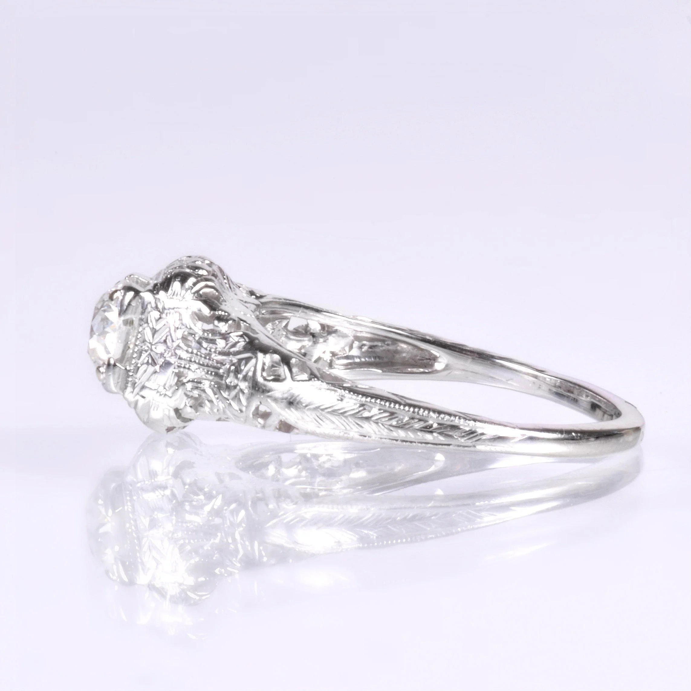 Antique Engagement Ring - Antique Platinum European Cut Diamond Ring 1910's Platinum European Cut Diamond =.35ct VS1/H Ring Size 5.5 (sizable) Ring measures approximately 7.5mm tall at center, back of band is 1.4mm wide.